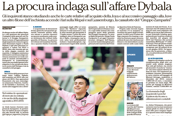 “Si allarga anche all’affare Dybala e alla gestione dei giocatori l’indagine della procura sul Palermo e il Gruppo Zamparini. Sotto la lente d’ingrandimento degli inquirenti ci sono le operazioni finanziare legate a Paulo Dybala e agli altri giocatori acquistati e ceduti nel 2015 e 2016, oltre alla vicenda già nota della doppia cessione del marchio. L’indagine comincia a delinearsi e settimana dopo settimana assumono un ruolo centrale le società riconducibili a Zamparini in Lussemburgo, tanto che una delle ipotesi investigative è che nel piccolo ducato al centro dell’Europa ci sia la cassaforte del gruppo. DYBALA Nel mirino della procura è entrato tutto l’affare Dybala, dall’acquisto nel 2012 alla cessione nel 2015. Due operazioni finanziarie che non coinvolgono solamente Palermo, Instituto de Cordoba e Juventus, ma anche altri soggetti che a diverso titolo hanno ricevuto compensi da Zamparini. In particolare 12 milioni di euro complessivi alla Pencill Hill, la società dell’agente argentino Gustavo Mascardi, che ha gestito l’arrivo in rosanero dell’attaccante. Una somma che è andata lievitando con i successivi passaggi per tutte le mediazioni fra avvocati, procuratori e familiari del giocatore. Una “corte dei miracoli” che si è ripresentata anche al momento della cessione alla Juventus. Gli inquirenti stanno passando al setaccio ogni bonifico per verificare che le cifre siano quelle denunciate e che siano state effettivamente pagate ai soggetti interessati. […]”.