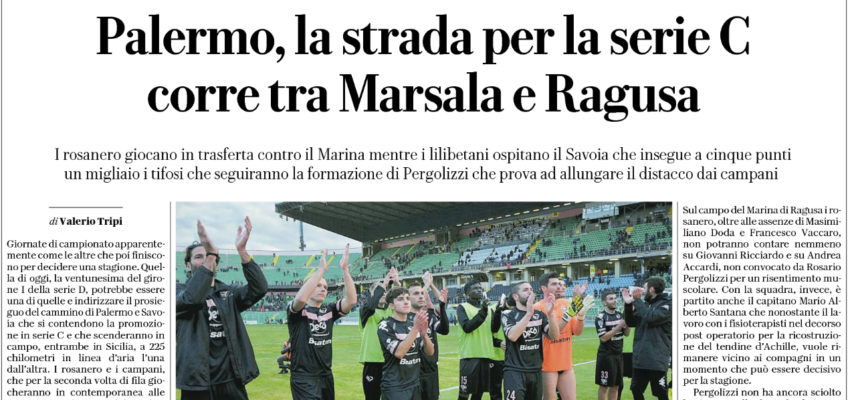 L’edizione odierna de “La Repubblica” si sofferma sulle sfide Marina di Ragusa-Palermo e Marsala-Savoia, che potrebbero decidere le sorti del campionato. Proprio il Marina di Ragusa sette giorni fa ha fermato sullo 0- 0 in Campania il Savoia, permettendo ai rosa di aumentare il vantaggio in classifica fino a cinque punti. Il Marsala, sconfitto al “Barbera” tre settimane fa, per bocca del suo presidente Domenico Cottone ha promesso il massimo impegno per fare in modo che i campani lascino punti anche allo stadio “ Antonino Lombardo Angotta”. Un favore interessato quello del Marsala, se si considera che sono in corsa con il Marina di Ragusa nella lotta per non retrocedere: le due avversarie di Savoia e Palermo, infatti, sono separate da un solo punto e occupano rispettivamente il quintultimo e sestultimo posto della classifica. A Ragusa saranno presenti circa mille tifosi rosanero, una cinquantina a Marsala a fare il tifo per la squadra di casa. Da Torre Annunziata viaggeranno al seguito del Savoia circa 150 tifosi campani. Il Marsala recupera il suo bomber Pietro Balistreri, palermitano, e punta a ritrovare una vittoria che manca dal 15 dicembre, giorno del bottino pieno contro il Corigliano. Sul campo del Marina di Ragusa i rosanero, oltre alle assenze di Masimiliano Doda e Francesco Vaccaro, non potranno contare nemmeno su Giovanni Ricciardo e su Andrea Accardi, non convocato da Rosario Pergolizzi per un risentimento muscolare. Con la squadra, invece, è partito anche il capitano Mario Alberto Santana che nonostante il lavoro con i fisioterapisti nel decorso post operatorio per la ricostruzione del tendine d’Achille, vuole rimanere vicino ai compagni in un momento che può essere decisivo per la stagione. In attacco, persiste il ballottaggio tra Ficarrotta falso nove e Sforzini nel ruolo di prima punta. Per il resto della formazione, invece, le scelte sembrano già quasi tutte prese con Pelagotti fra i pali protetto dai tre difensori Peretti, Lancini e Crivello; a centrocampo Martin, neo papà, giocherà in coppia con Kraja, in vantaggio su Ambro, con Langella a destra e Martinelli a sinistra; in attacco Felici e Floriano aspettano di conoscere il nome di chi completerà con loro il reparto offensivo.