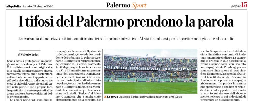L’edizione odierna de “La Repubblica” si sofferma sulla nuova iniziativa del Palermo. Innanzitutto, è stato chiesto a Leonardo Guarnotta di seguire la vicenda della convenzione per la concessione dello stadio “Barbera”. Per quanto riguarda la campagna #ionomitiroindietro, la somma che spetterebbe e che non si richiederà sarà raddoppiata e trasformata in sconto sul rinnovo dell’abbonamento nel caso in cui si deciderà di presentare un nuovo abbonato. Un abbonamento di gradinata spetterebbero poco meno di 25 euro di rimborso: al tifoso che non chiederà indietro i soldi saranno conteggiati quasi 50 euro di sconto sul suo abbonamento se presenterà un nuovo abbonato. Se tutti gli abbonati dovessero partecipare all’iniziativa l’anno prossimo i rosanero avrebbero 20 mila abbonati.