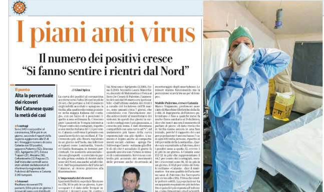 L’edizione odierna de “La Repubblica – Palermo” si sofferma sull’emergenza Coronavirus in Sicilia. 58 casi in più in 24 ore, che portano a 340 il numero degli infetti accertati e spingono la Sicilia alla quattordicesima posizione nella mappa italiana del contagio, con un balzo di 4 posizioni rispetto a una settimana fa. Crescono pure i pazienti in Terapia intensiva: l’11 per cento dei contagiati, rispetto a una media italiana del 7,5 per cento. Catania conferma il primato con quasi la metà dei casi siciliani. E’ l’incremento più alto finora registrato in un giorno nell’Isola, ma inferiore a regioni come Lombardia, Veneto ed Emilia Romagna in termini percentuali. Un aumento annunciato – dicono gli esperti – e correlato in parte alla prima ondata di rientri dalle zone del Nord, ma anche ad altri fattori. Dall’inquinamento dell’aria nel Catanese, al ricorso generoso alla Rianimazione. I pazienti finiti in ospedale finora sono 179, 50 in più in un giorno. A preoccupare è il dato delle Terapie intensive: i ricoveri sono 36, contro i 29 del giorno prima. In sostanza l’ 11 per cento sul totale dei positivi. In Lombardia sono il 7,2 per cento, in Emilia Romagna il 5,7 per cento. Per il professore Antonio Cascio, ordinario di Malattie infettive al Policlinico di Palermo, le spiegazioni possono essere molteplici: «Forse nell’Isola, avendo pochi casi, si fa un ricorso più frequente alla Terapia intensiva rispetto a regioni che hanno già esaurito i posti letto di Rianimazione e ricoverano anche altrove. Potremmo assistere anche al fatto che tante persone paucisintomatiche curate a domicilio abbiano un improvviso aggravamento, previsto al decimo giorno, e necessitino di Terapia intensiva». Il maggior ricorso alla Rianimazione sarebbe legato anche alla carenza di posti letto in altre discipline: «Qui manca il gradino intermedio dei reparti di subintensiva pneumologica e internistica – spiega un esperto dell’unità di crisi regionale – per cui finché abbiamo posto le Terapie intensive proteggono di più il paziente » . Ad oggi i posti di Terapia intensiva dedicati ai Covid sono 120 e risulta occupato il 30 per cento. Nei prossimi giorni verranno attivati altri 40 posti letto che, secondo i piani del governo – potrebbero arrivare a 650 in caso di necessità. L’effetto esodo A pesare sull’accelerazione anche i rientri da fuori regione: 34 mila quelli censiti dalla Regione. Il record a Palermo con 8 mila 500 registrati al portale dedicato, segue Catania con 6 mila 100, e poi a ruota Messina ( 4 mila), Trapani ( 3.300), Ragusa (3 mila), Siracusa e Agrigento (2.500), Enna ( 1.200). Secondo Laura Mascellaro, docente di Matematica e Fisica al liceo De Cosmi di Palermo, l’aumento dei casi dal 18 marzo era ipotizzabile: «Dall’ultima ondata dei rientri a cavallo del lockdown dell’ 11 marzo, sono passati circa 7 giorni, che coincidono con l’incubazione media antecedente al manifestarsi dei sintomi. In questi due giorni la curva dei contagi non è più gaussiana, a crescita più lenta. I dati diventano compatibili con una curva ad “s”, ad andamento più basso della curva esponenziale ma più ripido».