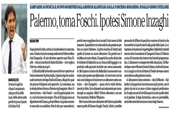“Dopo giorni di stallo, arriva un’accelerazione in casa rosanero. A darla è stato lo stesso presidente del Palermo Maurizio Zamparini. «Il mio direttore sportivo sarà Rino Foschi — dice ai microfoni di Radio Kiss Kiss — io lo voglio a Palermo, vediamo un po’». L’ufficialità dell’arrivo del nuovo direttore sportivo arriverà solamente il primo luglio, il giorno dopo la scadenza del contratto che lega Foschi al Cesena. Ma già fra qualche giorno il dirigente sarà operativo. Lui smentisce, ma la strada del suo ritorno a Palermo è già segnata. «Non c’è niente di vero — dice Foschi — con Zamparini parlo, è vero, ma lo facciamo da sempre. Fino al 30 giugno sono un dipendente del Cesena, poi sarò libero. In questo momento sono solo un candidato. Non lo dico per nascondermi, perché sono orgoglioso che si accosti il mio nome al club rosanero. Il presidente sta valutando la mia posizione per fare un nuovo Palermo». Il primo incarico di Foschi sarà quello di trovare un nuovo allenatore. Già perché con il via libera al nuovo diesse, Zamparini ha anche deciso che le richieste di Ballardini su un ritocco dell’ingaggio e soprattutto sulle garanzie tecniche non vanno assecondate. Ma il patron sa bene che Ballardini è ancora sotto contratto e per questo usa diplomazia. «In trent’anni non ho mai avuto bisogno di incontrare un allenatore sotto contratto — dice Zamparini — penso che lo vedrò direttamente in ritiro. Se lo chiamerò sarà solamente per comunicargli un acquisto. Oddo? Ottimo allenatore, ma non l’ho contattato. Stellone? Mi piace». Ma il nome del nuovo allenatore del Palermo potrebbe essere quello di Simone Inzaghi. Foschi, infatti, starebbe pensando di affidare la panchina rosanero al tecnico che ha esordito in A pochi mesi fa alla guida della Lazio. La situazione al momento è ingarbugliata. Ballardini martedì sera ha visto il consulente di Zamparini Gianni Di Marzio a cena. Un incontro che è stato tutto fuorché programmatico. L’allenatore è consapevole della situazione, Di Marzio dopo avere rifiutato il ruolo di diesse, rischia di rimanere ai margini se fra le richieste di Foschi dovesse esserci carta bianca sulla gestione tecnica. «L’allenatore è sotto contratto — dice Di Marzio — Ballardini e Zamparini si incontreranno al più presto, com’è giusto che sia in un sano e chiaro rapporto professionale».Fra gli annunci di ieri di Zamparini anche quello relativo al portiere. Il dopo Sorrentino, come era prevedibile, sarà nelle mani del ventenne croato Josip Posavec”. Questo quanto riportato dall’edizione odierna de “La Repubblica”.