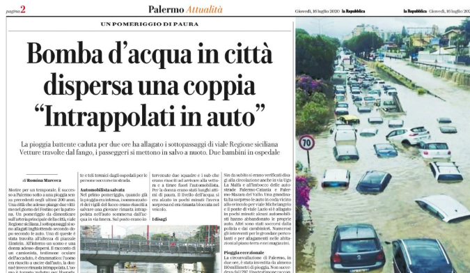 Repubblica: “Palermo, un pomeriggio di paura. Bomba d’acqua in città, dispersa una coppia: «Intrappolati in auto»”