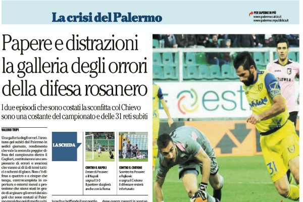 “Una galleria degli orrori. I trentuno gol subiti dal Palermo in sedici giornate, rendimento che vale la seconda peggior difesa del campionato dietro il Cagliari, costituiscono un campionario di errori e svarioni che vanno al di là di temi tattici e schemi di gioco. Non c’è difesa a quattro o a cinque che tenga, centrocampista in copertura o esterni messi a protezione che siano stati in grado di arginare gli errori dei singoli che sono costati al Palermo quasi due gol di media subiti a partita. Raramente i rosanero hanno subito gol su azione manovrata per sola bravura degli avversari. Nella maggior parte dei casi si è trattato di errori: per esempio a Milano, in occasione del gol dell’interista Icardi la sensazione è che con qualche attenzione in più la rete si potesse evitare. A completare il quadro si aggiungono anche le ingenuità che spesso sono costate calci di rigore poi trasformati in gol. Il primo gol subito dal Palermo in campionato nella sconfitta contro il Sassuolo, per esempio, nasce proprio da un’ingenuità di Rajkovic che frana addosso a Defrel causando il fallo da rigore. In questa galleria degli orrori ci sono gol che più di altri rappresentano al meglio le lacune della retroguardia rosanero. Nella casistica, infatti, si inserisce anche la papera di Posavec contro il Napoli. Un gol per la verità ininfluente, visto che si trattava del 3-0, che fa però il paio con l’altra papera del portiere in casa della Roma sulla punizione di Paredes. C’è da dire anche che Posavec, per rendimento complessivo, è fra i migliori del Palermo, ma anche lui non è completamente esente da colpe. Ci sono poi i gol subiti per incomprensioni o addirittura scontri fra compagni di squadra. A Pescara contro il Crotone, per esempio, proprio per effetto dello scontro fra Posavec e Rajkovic, costato la frattura al setto nasale per il serbo, è nato il vantaggio calabrese firmato da Trotta. Nella categoria incomprensioni rientrano di diritto le reti di domenica scorsa contro il Chievo: prima Andelkovic ferma il pallone per il gol di Birsa, poi Goldaniga serve un assist perfetto per il raddoppio di Pellissier. Goldaniga si è reso protagonista anche di un altro episodio: contro la Juventus nel tentativo di fermare un tiro-cross di Dani Alves ha allungato la gamba all’indietro deviando la palla e beffando il suo portiere. Ma la categoria più ricca di episodi è quella alla voce “disattenzioni e leggerezze”. Si parte da Genova in occasione del pareggio all’ultimo secondo di Bruno Fernandes, con la palla che poteva essere gestita meglio, fino ai tre gol subiti dopo essere passati in vantaggio contro l’Udinese e al gol del Milan di Lapadula. Tutte situazioni di gioco già evidenziate da Ballardini e De Zerbi prima e da Corini adesso: resta il dubbio che forse non siano tutte loro le colpe per l’ultimo posto in classifica.”. Questo quanto si legge sull’edizione odierna de “La Repubblica”.