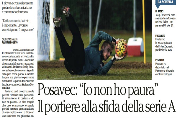 “L’intervista vuole farla in italiano nonostante sia arrivato a Palermo da pochi mesi. Un indizio di personalità per un ragazzo di vent’anni. Del resto Josip Posavec sa bene che non verrà giudicato per come parla la nostra lingua, ma piuttosto per come difenderà la porta del Palermo lasciata vacante da Stefano Sorrentino. Bastano però quattro parole perché l’indizio sulla personalità si trasformi in certezza. «Io non ho paura». Lo dice meglio che può, scandendo le parole perché nessuno possa dubitare di aver capito male. Lo dice con una sicurezza che gli arriva anche da una grande religiosità. Posavec è molto credente e ripete sempre che in ogni cosa «anche nel pallone che sbatte sulla traversa invece di finire in rete» ci sia la volontà di Dio. «Sorrentino è un grande portiere — dice il giovane croato – ma io sono pronto. Non ho paura di prendere il suo posto». Pensi che la sicurezza, la personalità, possano sfociare in spavalderia al limite della presunzione e invece Josip ti sorprende con un discorso tanto semplice quanto vero. «L’età non conta – dice Posavec – Conta la testa. Conta come ti alleni, come vai in campo, l’impegno che ci metti. Tutto il resto è una conseguenza». Gli esempi, del resto, non mancano. «Buffon – dice Josip – ha iniziato giovanissimo. È un grande portiere. È quello che in Italia mi piace di più mentre all’estero adoro Casillas». Due idoli non da poco per un ragazzo che lo scorso anno è stato catapultato in una realtà completamente diversa da quella dell’Inter Zapresic. «All’inizio è stata dura soprattutto perché al primo allenamento mi sono fratturato un dito – racconta Posavec – Ma quel problema non ha intaccato la mia voglia di arrivare. Sono riuscito ad andare avanti anche grazie all’aiuto dei miei compagni. Per primo Jajalo. Cosi mi sono ambientato e a Palermo mi trovo benissimo». Jaialo, ma anche Sicignano e il presidente Zamparini. Per il preparatore dei portieri Posavec è pronto. Per il presidente è il titolare indiscusso. «Lavorare con Vicè (Sicignano, ndr) è un privilegio. È molto bravo e sarà molto utile alla mia carriera. Il presidente, invece, ha sempre avuto belle parole per me e spero di potere ripagare la sua fiducia». Lo scorso anno, contro il Bologna, l’esordio in serie A. Una buona prestazione che allontana sempre di più Sorrentino dalla riconferma e avvicina Posavec alla maglia da titolare. Primo assaggio di quello che adesso attende il portiere contro alcuni tra gli attaccanti più forti del mondo. «Quello che temo maggiormente è Higuain – dice Josip – Poi ci sono Dybala e il mio connazionale Mandzukic. Tutti pericolosi ma sarà bello affrontarli». Questo ciò che si legge sull’edizione odierna de “La Repubblica”.