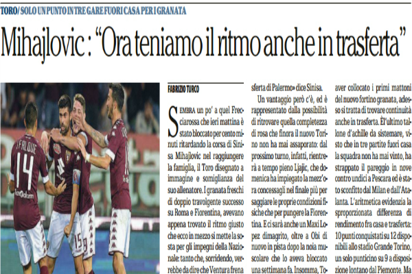 “Sembra un po’ a quel Frecciarossa che ieri mattina è stato bloccato per cento minuti ritardando la corsa di Sinisa Mihajlovic nel raggiungere la famiglia, il Toro disegnato a immagine e somiglianza del suo allenatore. I granata freschi di doppio travolgente successo su Roma e Fiorentina, avevano appena trovato il ritmo giusto che ecco in mezzo si mette la sosta per gli impegni della Nazionale: tanto che, sorridendo, verrebbe da dire che Ventura frena la rincorsa di Mihajlovic. «Abbiamo preso un bel ritmo ma onestamente non so se la sosta cada nel momento sbagliato, lo valuteremo soltanto dopo la trasferta di Palermo» dice Sinisa. Un vantaggio però c’è, ed è rappresentato dalla possibilità di ritrovare quella completezza di rosa che finora il nuovo Torino non ha mai assaporato: dal prossimo turno, infatti, rientrerà a tempo pieno Ljajic, che domenica ha impiegato la mezz’ora concessagli nel finale più per saggiare le proprie condizioni fisiche che per pungere la Fiorentina. E ci sarà anche un Maxi Lopez dimagrito, oltre a Obi di nuovo in pista dopo la noia muscolare che lo aveva bloccato una settimana fa. Insomma, Toro che recupera ogni tassello, che si compatta più che mai, per assestare il prossimo colpo al campionato. L’obiettivo, infatti, è già fissato: perché dopo aver collocato i primi mattoni del nuovo fortino granata, adesso si tratta di trovare continuità anche in trasferta. Èl’ultimo tallone d’achille da sistemare, visto che in tre partite fuori casa la squadra non ha mai vinto, ha strappato il pareggio in nove contro undici a Pescara ed è stato sconfitto dal Milan e dall’Atalanta. L’aritmetica evidenzia la sproporzionata differenza di rendimento fra casa e trasferta: 10 punti conquistati su 12 disponibili allo stadio Grande Torino, un solo punticino su 9 a disposizione lontano dal Piemonte. Ma servirà il miglior Toro, con il miglior Belotti: il Gallo è ormai un leader indiscusso, il nuovo idolo della curva Maratona. Dopo aver segnato quattro gol in casa (e uno solo in trasferta) adesso deve diventare il trascinatore del reparto offensivo anche lontano dal Grande Torino dove il Toro ha segnato soltanto 3 gol, contro i 10 casalinghi. Migliorare le statistiche “straniere” vorrebbe dire poter davvero lottare con le big del campionato guardandole dritte negli occhi, soprattutto se si considera quel numero legato all’attacco, visto che dopo sette partite il Torino non segnava 13 gol in serie A dal campionato 1976/77, quello dei famosi 50 punti con Pulici e Graziani davanti. «Avanti così, non fermiamoci qui dopo aver battuto un’altra grande squadra». In mezzo c’è il doppio appuntamento in Nazionale contro Spagna (allo Juventus Stadium) e Macedonia, ma il conto alla rovescia verso il Palermo è già iniziato. Perché si tratta di una tappa fondamentale nel cammino di crescita granata.”. Questo quanto si legge sull’edizione odierna de “La Repubblica”.