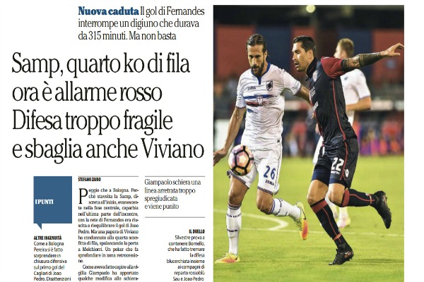 “Peggio che a Bologna. Perchè stavolta la Samp, discreta all’inizio, evanescente nella fase centrale, caparbia nell’ultima parte dell’incontro, con la rete di Fernandes era riuscita a riequilibrare il gol di Joao Pedro. Ma una papera di Viviano ha condannato alla quarta sconfitta di fila, spalancando la porta a Melchiorri. Un poker che fa sprofondare in zona retrocessione. Come aveva fatto capire alla vigilia Giampaolo ha apportato qualche modifica allo schieramento tradizionale, non tanto per turn over, il tecnico sostiene che in 5 giorni qualsiasi giocatore è in grado di recuperare energie, quanto per dare più efficacia alla manovra. Certo, una sostituzione era obbligata, vista la squalifica di Barreto, e per il ruolo di centrocampista a destra il tecnico ha scelto Praet, che secondo lui è riciclabile in mezzo al campo, stante l’abbondanza di trequartisti. Va detto subito che il belga non se l’è cavata male nella zona nevralgica del campo: nel primo tempo ha recuperato un paio di palloni importanti e al 43’ del primo tempo, imbeccato da Alvarez, ha sfiorato persino il possibile pareggio (i padroni di casa erano andati in vantaggio sei minuti prima con Joao Pedro), con una conclusione deviata da un difensore e finita a lato di poco. Praet non ha ancora la continuità del centrocampista da campionato italiano, ma tutto sommato la sfida di ieri ha fatto capire che su tale mossa Giampaolo può insistere. Non era invece, tornando alle novità proposte, obbligato l’avvicendamento di Torreira con Cigarini. In questa scelta può aver pesato una certa stanchezza mostrata dall’uruguaiano a Bologna e il pieno recupero di un giocatore che era stato acquistato per essere titolare. Fatto sta che Cigarini non è andato male, ha impegnato Storari con un tiro da fuori area (deviato in corner con volo plastico dal portiere) e ha cercato di dettare i tempi del gioco, anche se per arrivare al top ha bisogno ancora di qualche partita. Dove invece Giampaolo non ha ritenuto cambiare è in attacco e in difesa. Nel reparto avanzato si pensava che potesse riposare Quagliarella, anche ieri sera piuttosto appannato, e invece l’allenatore lo ha schierato nuovamente, lasciando in panchina Schick. La giovane punta poi è entrata, ma al posto di Muriel, che nel primo tempo si è sfiancato in un ossessivo, quanto infruttuoso pressing sui difensori avversari. E nulla il tecnico ha mutato nemmeno nel reparto arretrato, non azzardando l’impiego del tuttofare Eramo, provato in settimana, ma confermando il frastonato Pereira, anche a Cagliari responsabile in occasione dell’uno a zero. Il portoghese al 37’ del primo tempo si è fatto saltare in maniera ingenua quasi sulla linea di fondo da Padoin, il resto è stata inevitabile conseguenza: cross a mezza altezza, tap in vincente di Joao Pedro, bravo ad anticipare Skriniar e a battere Viviano. Anche in Sardegna, com’era accaduto con il Bologna, il vantaggio avversario ha capovolto la gara. La Samp, dopo un inizio sofferto, nella prima mezz’ora aveva dato l’impressione di controllare la gara, cercando l’offesa in quattro occasioni e senza patire troppo la controffensiva della squadra di Rastelli. Purtroppo fra i difetti dei blucerchiati che cominciano ad affiorare c’è un’evidente sterilità offensiva. Sarà forse questione di poca cattiveria o scarsa mira, fatto sta che nella prima parte la squadra di Giampaolo non riesce a capitalizzare né al 16’, quando Alvarez chiude bene un triangolo con Regini, ma si fa ribattere il tiro, nè al 25’, quando Skriniar tutto solo su un corner non riesce ad inquadrare la porta con la deviazione di testa. Certo, nella non prolificità blucerchiata c’è anche il portiere avversario, nella fattispecie l’ex Storari, che devia bene su Cigarini al 25’, ma è la Samp che dovrebbe fare di più e stavolta non si può inveire nemmeno contro le decisioni arbitrali, visto che al 30’ del primo tempo la trattenuta di Murru c’è, ma la caduta di Alvarez è molto accentuata. La lacuna più grande però è la propensione della formazione blucerchiata ad andare a corrente alternata. Dopo il gol del Cagliari i blucerchiati per lunghi tratti sono spariti dal campo, perdendo le distanze fra i reparti. Le mosse di Giampaolo, invero azzardate, con tante punte in campo nel finale, hanno svegliato il gruppo e portato al pari di Bruno Fernandes al 41’ della ripresa (l’astinenza aveva toccato i 315 minuti), ma causato anche la sconfitta. Perchè sull’uno a uno la Samp era troppo sbilanciata, non aveva un difensore a destra e la frittata di Viviano (clamoroso sbaglio su un tentativo di rinvio in uscita) ha fatto il resto. Chi lotta per salvarsi, deve sapersi accontentare. E l’obiettivo della Sampdoria in questo momento altro non è che la sopravvivenza”. Questo quanto si legge sull’edizione odierna de “La Repubblica”.