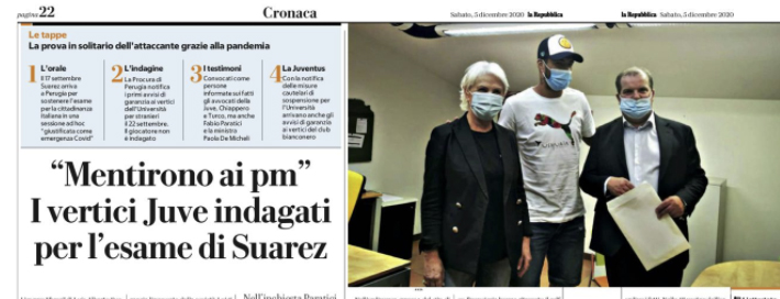 Repubblica: “«Prova a porte chiuse, per fortuna le persone non possono entrare per via del Covid». “Mentirono ai pm”. I vertici Juve indagati per l’esame di Suarez”