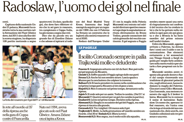 L’edizione odierna de “La Repubblica” dedica spazio a Rdoslaw Murawski, che ieri ha realizzato il gol del pari contro il Foggia: