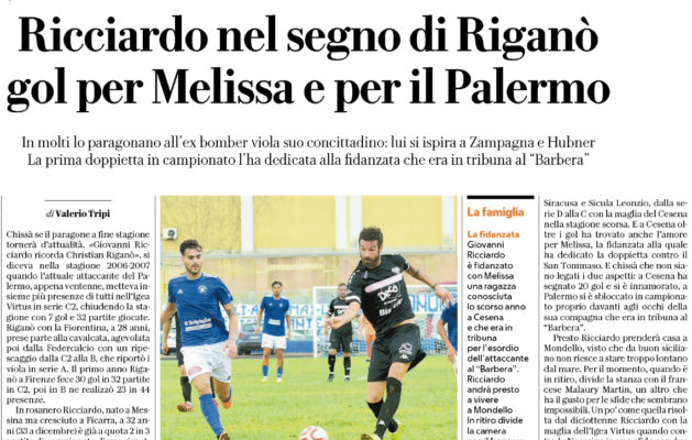 L’edizione odierna de “La Repubblica” propone un focus su Giovanni Ricciardo, attaccante del Palermo. «Giovanni Ricciardo ricorda Christian Riganò» , si diceva nella stagione 2006- 2007 quando l’attuale attaccante del Palermo, appena ventenne, metteva insieme più presenze di tutti nell’Igea Virtus in serie C2, chiudendo la stagione con 7 gol e 32 partite giocate. Riganò con la Fiorentina, a 28 anni, prese parte alla cavalcata, agevolata poi dalla Federcalcio con un ripescaggio dalla C2 alla B, che riportò i viola in serie A. Il primo anno Riganò a Firenze fece 30 gol in 32 partite in C2, poi in B ne realizzò 23 in 44 presenze. Ricciardo, nato a Messina ma cresciuto a Ficarra, a 32 anni (33 a dicembre) è già a quota 2 in 3 partite di campionato. Forse rispetto a Riganò lui è più esile, ma il modo in cui protegge la palla e mette il fisico nei contrasti non ha nulla da invidiare al bomber di Lipari che lui stesso ammirava da giocatore. In estate lo hanno richiesto i due Messina, ACR ed FC, ma appena c’è stata la possibilità del Palermo lui non ha sentito ragioni: «Quando si vociferava del possibile fallimento del Palermo – ha detto Ricciardo al sito ufficiale del club – per noi che siamo siciliani era una notizia triste, ma subito ho pensato che io potevo essere l’uomo giusto per giocare in questa squadra». Per Rinaldo Sagramola notarlo è stato facile: 20 gol e promozione, la terza negli ultimi quattro anni dopo Siracusa e Sicula Leonzio, dalla serie D alla C con la maglia del Cesena nella stagione scorsa. E a Cesena oltre i gol ha trovato anche l’amore per Melissa, la fidanzata alla quale ha dedicato la doppietta contro il San Tommaso. E chissà che non siano legati i due aspetti: a Cesena ha segnato 20 gol e si è innamorato, a Palermo si è sbloccato in campionato proprio davanti agli occhi della sua compagna che era in tribuna al “Barbera”. Ricciardo prenderà casa a Mondello e in ritiro condivide la stanza con Martin. Forse la sua carriera per come era iniziata non è stata come ci si poteva aspettare. Il Messina di Franza in A aveva una sorta di opzione sul suo cartellino che poi non ha mai esercitato.