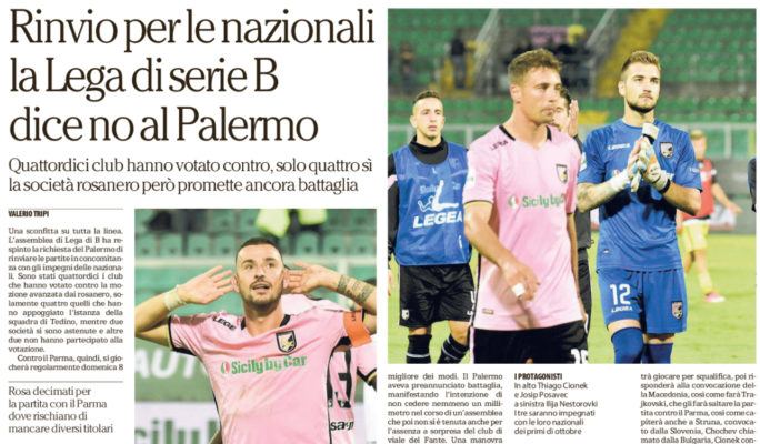 L’edizione odierna de “La Repubblica” riporta la decisione della Lega Serie B di non rinviare le gare dei rosanero in concomitanza con gli impegni dei nazionali. Ecco adesso, come si muoverà il Palerm0: