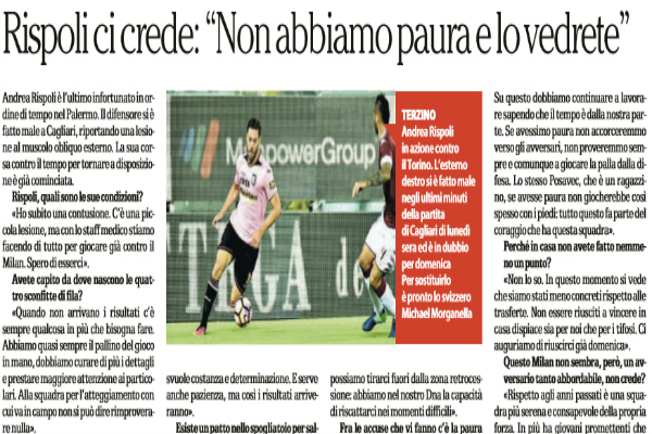 “Andrea Rispoli è l’ultimo infortunato in ordine di tempo nel Palermo. Il difensore si è fatto male a Cagliari, riportando una lesione al muscolo obliquo esterno. La sua corsa contro il tempo per tornare a disposizione è già cominciata. Rispoli, quali sono le sue condizioni? «Ho subito una contusione. C’è una piccola lesione, ma con lo staff medico stiamo facendo di tutto per giocare già contro il Milan. Spero di esserci». Avete capito da dove nascono le quattro sconfitte di fila? «Quando non arrivano i risultati c’è sempre qualcosa in più che bisogna fare. Abbiamo quasi sempre il pallino del gioco in mano, dobbiamo curare di più i dettagli e prestare maggiore attenzione ai particolari. Alla squadra per l’atteggiamento con cui va in campo non si può dire rimproverare nulla». Come invertire la tendenza? «Non è che ci sia una ricetta precisa. Stiamo lavorando per capire dove toppiamo. Abbiamo un allenatore capace di leggere e risolvere i problemi. Crediamo in lui e nel suo staff. De Zerbi è esigente, cerca un gioco, vuole partire dalla difesa e applicare al massimo le sue idee non è facile. Ci vuole costanza e determinazione. E serve anche pazienza, ma così i risultati arriveranno». Esiste un patto nello spogliatoio per salvare la panchina di De Zerbi? «Sappiamo che dobbiamo stare uniti e compatti per venire fuori da questa situazione. Mandare via l’allenatore è facile, ma alla fine in campo ci andiamo noi giocatori e tocca a noi invertire la tendenza. Vogliamo evitare di continuare a cambiare allenatore. Siamo convinti che con De Zerbi possiamo tirarci fuori dalla zona retrocessione: abbiamo nel nostro Dna la capacità di riscattarci nei momenti difficili». Fra le accuse che vi fanno c’è la paura che troppo spesso subentra quando prendete un gol. È davvero così? «La squadra nelle difficoltà cerca di essere viva e prova a reagire. Anche sul piano caratteriale proviamo a dire la nostra. Semmai dobbiamo leggere meglio determinate situazioni e stare ancora più compatti. Sapere incassare i colpi e ripartire. Su questo dobbiamo continuare a lavorare sapendo che il tempo è dalla nostra parte. Se avessimo paura non accorceremmo verso gli avversari, non proveremmo sempre e comunque a giocare la palla dalla difesa. Lo stesso Posavec, che è un ragazzino, se avesse paura non giocherebbe così spesso con i piedi: tutto questo fa parte del coraggio che ha questa squadra». Perché in casa non avete fatto nemmeno un punto? «Non lo so. In questo momento si vede che siamo stati meno concreti rispetto alle trasferte. Non essere riusciti a vincere in casa dispiace sia per noi che per i tifosi. Ci auguriamo di riuscirci già domenica». Questo Milan non sembra, però, un avversario tanto abbordabile, non crede? «Rispetto agli anni passati è una squadra più serena e consapevole della propria forza. In più ha giovani promettenti che con l’aiuto dei risultati e di un allenatore bravo come Montella si stanno mettendo in mostra. Affrontare in questo momento il Milan è stimolante, la voglia di mettersi in mostra e confrontarsi con una grande squadra c’è tutta. Speriamo che ci siano anche i risultati».”. Questo quanto si legge sull’edizione odierna de “La Repubblica”.