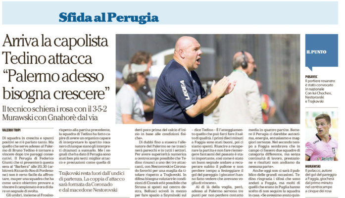 Al di là della voglia, però, adesso al Palermo servono tre punti per non perdere contatto con le prime e dimostrare che fra le pretendenti alla promozione ci sono anche i rosanero dopo una vittoria e tre pareggi. «Quello che ci è rimasto un po’ sullo stomaco – dice Tedino – è il mancato successo contro l’Empoli. Con quei due punti in più viaggeremmo al ritmo di due punti di media in quattro partite. Battere il Perugia ci darebbe autostima, energia, entusiasmo e maggiori certezze. Nel secondo tempo a Foggia sembrava che in campo ci fossero due squadre di categoria differente, ma senza continuità di lavoro, prestazione e risultati non andiamo da nessuna parte». Anche oggi non ci sarà il pubblico delle grandi occasioni. Tedino ringrazia i tifosi che sono andati a Foggia, ma molti di quelli che erano in Puglia hanno scelto di non seguire la squadra in casa. «Se avessimo avuto quindicimila tifosi di media – dice – sicuramente avremmo qualche punto in più. Me ne sono accorto a Foggia grazie al clima che abbiamo trovato. Quello contro il Perugia sarà un incontro fra due pugili che lotteranno con la guardia bassa per prevalere»”. Questo quanto riportato dall’edizione odierna de “La Repubblica”.