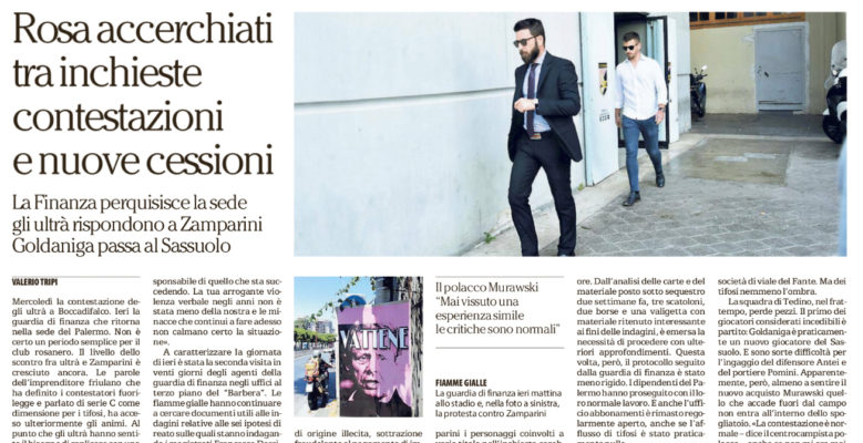 “Mercoledì la contestazione degli ultrà a Boccadifalco. Ieri la guardia di finanza che ritorna nella sede del Palermo. Non è certo un periodo semplice per il club rosanero. Il livello dello scontro fra ultrà e Zamparini è cresciuto ancora. Le parole dell’imprenditore friulano che ha definito i contestatori fuorilegge e parlato di serie C come dimensione per i tifosi, ha acceso ulteriormente gli animi. Al punto che gli ultrà hanno sentito il bisogno di replicare con una nota. «In attesa – si legge – di conoscere i risultati dei controlli della finanza nei tuoi confronti che chiariranno a tutti chi è veramente il “fuorilegge”, vogliamo ricordarti che sei tu l’unico responsabile di quello che sta succedendo. La tua arrogante violenza verbale negli anni non è stata meno della nostra e le minacce che continui a fare adesso non calmano certo la situazione». A caratterizzare la giornata di ieri è stata la seconda visita in venti giorni degli agenti della guardia di finanza negli uffici al terzo piano del “Barbera”. Le fiamme gialle hanno continuare a cercare documenti utili alle indagini relative alle sei ipotesi di reato sulle quali stanno indagando i magistrati Francesca Dessì, Andrea Fusco e Dario Scaletta coordinati dal procuratore capo Francesco Lo Voi e dall’aggiunto Salvatore De Luca: appropriazione indebita, riciclaggio, autoriciclaggio, impiego di proventi di origine illecita, sottrazione fraudolenta al pagamento di imposte e falso in bilancio aggravato dalla transnazionalità. L’unica certezza sulle indagini è la vasto del campo in cui si muovono gli accertamenti. Gli indagati al momento sono otto: oltre a Zamparini i personaggi coinvolti a vario titolo nell’inchiesta sarebbero i legali rappresentanti delle società al centro del lavoro degli inquirenti. La perquisizione di ieri è una prosecuzione del lavoro iniziato venerdì 7 luglio e andato avanti per diciassette ore. Dall’analisi delle carte e del materiale posto sotto sequestro due settimane fa, tre scatoloni, due borse e una valigetta con materiale ritenuto interessante ai fini delle indagini, è emersa la necessità di procedere con ulteriori approfondimenti. Questa volta, però, il protocollo seguito dalla guardia di finanza è stato meno rigido. I dipendenti del Palermo hanno proseguito con il loro normale lavoro. E anche l’ufficio abbonamenti è rimasto regolarmente aperto, anche se l’afflusso di tifosi è stato praticamente nullo. A Boccadifalco, invece, dopo la contestazione di mercoledì ieri erano presenti solamente le forze dell’ordine: due camionette della polizia oltre agli agenti della Digos e agli steward della società di viale del Fante. Ma dei tifosi nemmeno l’ombra. La squadra di Tedino, nel frattempo, perde pezzi. Il primo dei giocatori considerati incedibili è partito: Goldaniga è praticamente un nuovo giocatore del Sassuolo. E sono sorte difficoltà per l’ingaggio del difensore Antei e del portiere Pomini. Apparentemente, però, almeno a sentire il nuovo acquisto Murawski quello che accade fuori dal campo non entra all’interno dello spogliatoio. «La contestazione è normale – dice il centrocampista polacco – anche se non mi ero mai trovato in una situazione come quella di mercoledì. I miei compagni non hanno avuto delle reazioni particolari perché pensiamo solo al lavoro sul campo»”.