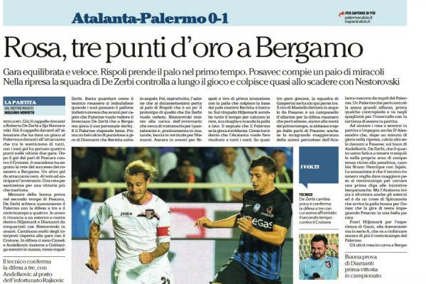 L’edizione odierna de “La Repubblica” ha analizzato la vittoria di ieri del Palermo conquistata contro l’Atalanta. Di seguito quanto si legge: “Giù il cappello davanti a Roberto De Zerbi e Ilija Nestorovski. Giù il cappello davanti all’allenatore che ha dato un gioco al Palermo e davanti all’attaccante che tra lo scetticismo di tutti, con i suoi gol ha portato quattro punti nelle ultime due gare. Dopo il gol del pari di Pescara contro il Crotone, il macedone ha segnato la rete del successo dei rosanero a Bergamo. Un altro gol da attaccante vero. Al volo ad anticipare l’avversario. Una rete pesantissima per una vittoria più che meritata. Memore della buona prova nel secondo tempo di Pescara, De Zerbi schiera nuovamente il Palermo con la difesa a tre e il centrocampo a quattro. In avanti rinuncia a un esterno e mette dentro Hiljemark e Diamanti da trequartisti con Nestorovski in avanti. Cambiano molti degli interpreti rispetto alla gara con il Crotone. In difesa ci sono Cionek e Andelkovic insieme a Goldaniga mentre in mezzo, viene rispolverato Chochev mentre Gazzi termina in panchina. Del resto, De Zerbi aveva annunciato un mini turn over dettato dalle tre partite ravvicinate (sabato pomeriggio i rosa tornano in campo al “Barbera” contro la Juventus) e dalle non perfette condizioni di alcuni giocatori. Nelle partite di calcio ci sono emozioni, sensazioni che ti fanno capire subito se una squadra è in palla o meno. E il Palermo, quello dei primi minuti di Bergamo, dimostra subito di essere in partita. Lo si vede da come la squadra è messa in campo, come copre gli spazi, come cerca la profondità. Già, la profondità. Insieme al possesso palla è un must del calcio di De Zerbi. Basta guardare come il tecnico rosanero si imbufalisce quando i suoi passano il pallone indietro invece che avanti per capire che Palermo vuole vedere il bresciano De Zerbi che a Bergamo gioca il suo personale derby. E il Palermo risponde bene. Prima un bel calcio di punizione a giro di Diamanti che Berisha salva in angolo. Poi, soprattutto, l’azione che al diciassettesimo porta al palo di Rispoli che è un po’ il prototipo di quello che De Zerbi vuole vedere. Nestorovski resiste alla carica dell’avversario che cerca di trattenerlo per i pantaloncini e, praticamente in mutande, lancia in verticale per Diamanti. Ancora in avanti per Rispoli e tiro di prima intenzione con la palla che colpisce la base del palo mentre Berisha è battuto. Sul rimpallo Hiljemark avrebbe tutto il tempo per calciare in rete, ma sbaglia e manda la palla a lato. Il segnale che il Palermo se la gioca è evidente. Come è evidente che l’Atalanta vuole fare risultato a tutti i costi. Su quattro gare giocate, la squadra di Gasperini ne ha sin qui perse tre. Il tiro di Masiello deviato in angolo da Posavec è un campanello d’allarme per la difesa rosanero che però adesso, siamo alla metà del primo tempo, si abbassa troppo dalle parti di Posavec anche se la stragrande maggioranza della azioni pericolose dell’Atalanta nascono da regali del Palermo. Un Palermo che però controlla senza grandi affanni, prova qualche contropiede e va negli spogliatoi per l’intervallo con la certezza di essere in partita. Ad aiutare i rosa a sentirsi in partita s’impegna anche D’Alessandro che, dopo un minuto di gioco nella ripresa, calcia alto solo davanti a Posavec sul buco di Andelkovic. De Zerbi, che il quarto uomo fatica a tenere tranquillo nella propria area di competenza vicino alla panchina, cambia Bruno Henrique con Jajalo. La sensazione è che il tecnico rosanero voglia dare maggiore peso al centrocampo per cercare una prima diga alle iniziative bergamasche. Ma l’Atalanta inizia a sfruttare anche gli esterni ed è da un cross di Spinazzola che arriva la palla buona per Gomez che la gira di testa impegnando Posavec in una bella parata. Fuori Hiljemark per l’esperienza di Gazzi, alla duecentesima in serie A, che va a rinforzare ancora di più il centrocampo del Palermo. Gli ultrà rosa in curva a Bergamo cantano vi vogliamo così segno che apprezzano la combattività del Palermo che poco prima della mezzora si spinge al limite dell’area bergamasca. Un buon momento fotografato dal colpo di testa di poco a lato di Goldaniga sulla punizione di Diamanti e dal tiro sull’esterno di Rispoli servito ancora dal capitano rosanero. De Zerbi capisce che può vincere la partita e si gioca la carta Balogh che, a sei minuti dalla fine, prende il posto di Diamanti. E, infatti, a un minuto dal novantesimo, il Palermo vince la gara. Nestorovski, al volo, trova il suo secondo gol in due partite. Un gol che questa volta vale tra punti d’oro”.