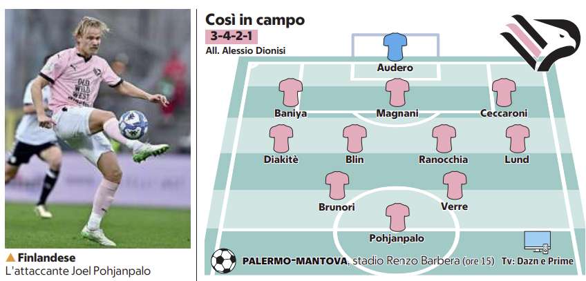 Il Mantova, attualmente quindicesimo, ha solo sette punti di vantaggio sul Cosenza ultimo e arriva al Barbera con l’urgenza di fare punti. Nel girone d’andata i lombardi hanno già messo in difficoltà i rosanero, bloccandoli sullo 0-0 al Martelli. Dionisi vuole ribaltare quel risultato: «Non c’è euforia, ma abbiamo l’atteggiamento giusto per affrontare un Mantova che costruisce dal basso, ha un’identità chiara e più possesso palla di tutti in Serie B. Difficilmente il loro approccio cambierà, ma noi cerchiamo il successo».