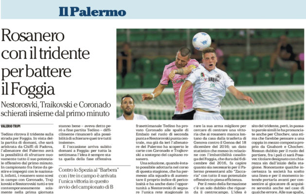 “Tedino ritrova il tridente sulla strada per Foggia. In vista della partita di domani, che sarà arbitrata da Chiffi di Padova, l’allenatore del Palermo avrà la possibilità di sfruttare nuovamente tutto il suo potenziale offensivo dal primo minuto. In campionato fra forze da gestire e impegni con le nazionali, infatti, i rosanero sono scesi in campo con Coronado, Trajkovski e Nestorovski tutti e tre contemporaneamente solamente nella prima giornata contro lo Spezia. Poi a Brescia, per i noti impegni dei nazionali, del tridente a disposizione dell’allenatore c’era solamente Coronado; con l’Empoli invece i due macedoni si sono alternati in considerazione delle condizioni fisiche non proprio perfette. «Se stanno bene – aveva detto però a fine partita Tedino – difficilmente rinuncerò alla possibilità di schierare quei tre tutti insieme». E l’occasione arriva subito domani a Foggia: per tutta la settimana l’idea è sempre stata quella della fase offensiva con tre giocatori, pur con tutte le varianti del caso: dal doppio trequartista alle spalle dell’unica punta fino al tridente puro in un futuribile 4-3-3 che però non si vedrà domani contro i rossoneri pugliesi.