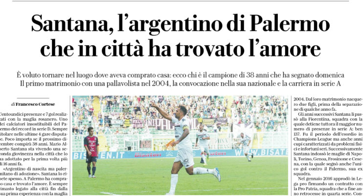 L’edizione odierna de “La Repubblica” ha analizzato il momento di Santana e la sua esperienza in rosanero, sia del passato che del presente. Il quotidiano lo definisce uno dei calciatori insostituibili del Palermo dei record in serie D. Sempre titolare nelle ultime 4 gare disputate. Poco importa se il prossimo dicembre compirà 38 anni. Mario Alberto Santana sta vivendo una seconda giovinezza nella città che lo ha adottato per la prima volta più di 16 anni fa. «Argentino di nascita ma palermitano di adozione» . Santana lo ripete spesso. A Palermo ha comprato casa e trovato l’amore. È sempre rimasto legato alla città fin dalla sua prima esperienza con la maglia rosanero nella stagione 2002-2003, tanto da accettare un contratto annuale nella nuova società di Mirri e Di Piazza dopo il fallimento del vecchio Palermo e la ripartenza dalla D.