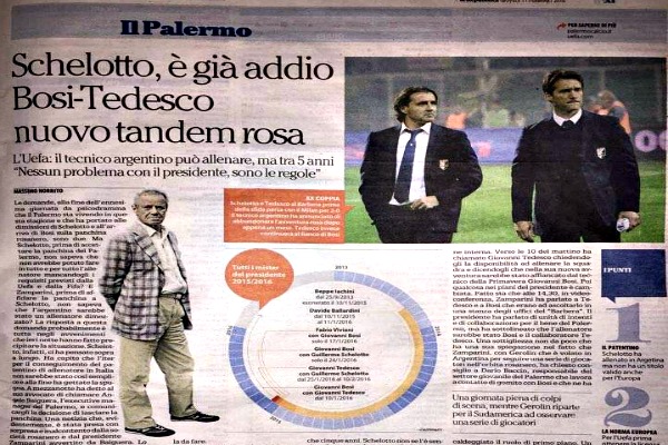 L’edizione odierna de “La Repubblica” parla del caso Schelotto, il tecnico argentino che a detta dell’Uefa, può allenare ma solo tra 5 anni. Barros saluta Palermo, ma nessun problema con il patron come lui stesso dichiara: «Nessun problema con il presidente, sono le regole». Il quotidiano poi scrive: “Per allenare il Palermo Guillermo Barros Schelotto avrebbe dovuto iniziare un percorso che prevedeva il conseguimento del patentino di base e poi il master a Coverciano. Un iter burocratico che sarebbe potuto durare anche cinque anni. Schelotto non se l’è sentita e ha gettato la spugna. E ieri l’ormai ex ‘tecnico’ si è presentato a Boccadifalco insieme ai suoi collaboratori, tra i quali anche il gemello Gustavo, ha salutato la squadra. La panchina dunque è stata affidata a Giovani Bosi e a Tedesco a fare da vice”.