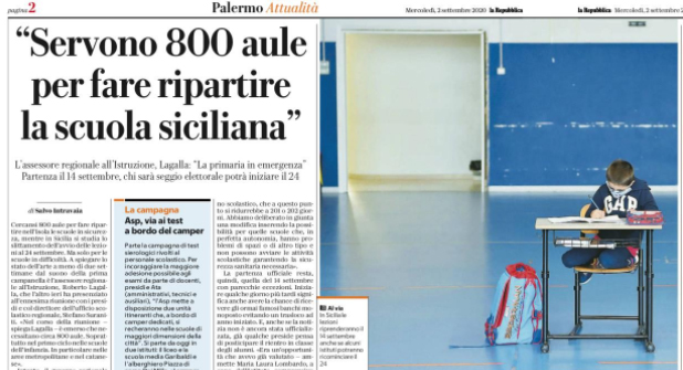L’edizione odierna de “La Repubblica” si sofferma sui problemi relativi alla riapertura delle scuole. Si cercano 800 aule e si studia lo slittamento dell’avvio delle lezioni al 24 settembre, almeno in Sicilia. L’assessore regionale all’Istruzione, Roberto Lagalla «Nel corso della riunione — spiega Lagalla — è emerso che necessitano circa 800 aule. Soprattutto nel primo ciclo nelle scuole dell’infanzia. In particolare nelle aree metropolitane e nel catanese. Abbiamo pensato — continua Lagalla — che non ha senso costringere tutte le scuole della regione, anche quelle che possono aprire in sicurezza perché hanno spazi adeguati, a partire il 24 settembre. Perché in questo modo si riducono i margini di manovra dei consigli d’istituto sull’anno scolastico, che a questo punto si ridurrebbe a 201 o 202 giorni. Abbiamo deliberato in giunta una modifica inserendo la possibilità per quelle scuole che, in perfetta autonomia, hanno problemi di spazi o di altro tipo e non possono avviare le attività scolastiche garantendo la sicurezza sanitaria necessaria».