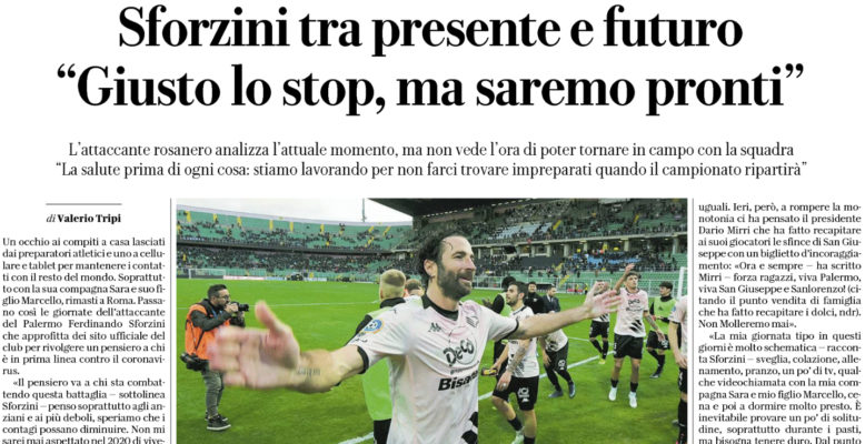 L’edizione odierna de “La Repubblica” riporta le dichiarazioni di Ferdinando Sforzini, attaccante del Palermo: «Il pensiero va a chi sta combattendo questa battaglia, penso soprattutto agli anziani e ai più deboli, speriamo che i contagi possano diminuire. Non mi sarei mai aspettato nel 2020 di vivere una situazione del genere, ma bisogna andare avanti con lucidità, coraggio e senso civico. Sospensione allenamenti? La società ha fatto bene, è chiaro che bisogna prima tutelare la salute di tutti. Poi quando sarà finita l’emergenza ci faremo trovare pronti per sostenere una nuova preparazione, praticamente come quella estiva. Non ci sono alternative perché abbiamo un obiettivo importante da raggiungere e credo che questo sia l’unico modo per centrarlo. In un momento delicato come questo — racconta l’attaccante classe ‘84 — noi over non possiamo che essere d’esempio per gli under. Siamo di continuo in contatto con i più giovani, anche se virtualmente, e li sosteniamo. In questi ultimi giorni, un po’ per farci compagnia ed un po’ per coinvolgere i tifosi, ci siamo collegati più volte in diretta su Instagram. Mi hanno colpito molto le parole dei nostri sostenitori. Ci hanno detto grazie per avere regalato qualche minuto di spensieratezza e anche in questa occasione siamo stati ricoperti d’affetto. I tifosi sono eccezionali — fa notare l’attaccante — e lo hanno dimostrato per l’ennesima volta domenica quando in massa hanno partecipato, è stato un gesto che mi ha emozionato». I giorni a casa, a parte le dirette e le sfide social, sono quasi tutte uguali. Ieri, però, a rompere la monotonia ci ha pensato il presidente Dario Mirri che ha fatto recapitare ai suoi giocatori le sfince di San Giuseppe con un biglietto d’incoraggiamento: «Ora e sempre — ha scritto Mirri — forza ragazzi, viva Palermo, viva San Giuseppe e Sanlorenzo! (citando il punto vendita di famiglia che ha fatto recapitare i dolci, ndr). Non molleremo mai». «La mia giornata tipo in questi giorni è molto schematica — racconta Sforzini — sveglia, colazione, allenamento, pranzo, un po’ di tv, qualche videochiamata con la mia compagna Sara e mio figlio Marcello, cena e poi a dormire molto presto. È inevitabile provare un po’ di solitudine, soprattutto durante i pasti, ma bisogna tenere duro. Dal punto di vista atletico stiamo svolgendo un programma che prevede l’alternanza tra un lavoro di forza e circuiti con ripetute di fitness ad alta intensità che sollecitano le frequenze cardiache simulando la corsa. A Palermo mi trovo incredibilmente bene — conclude Sforzini — è una città fantastica e una piazza che ha fatto la storia del calcio negli ultimi quindici anni. Ci sono i presupposti per tornare ai massimi livelli. Voglio a tutti i costi ripetere la vittoria del campionato dell’anno scorso ad Avellino. In questi giorni avremmo dovuto preparare lo scontro con il Savoia, ma ora è superfluo pensarci. Il desiderio di tutti noi è tornare al più presto alla vita normale e riprendere a giocare a calcio».