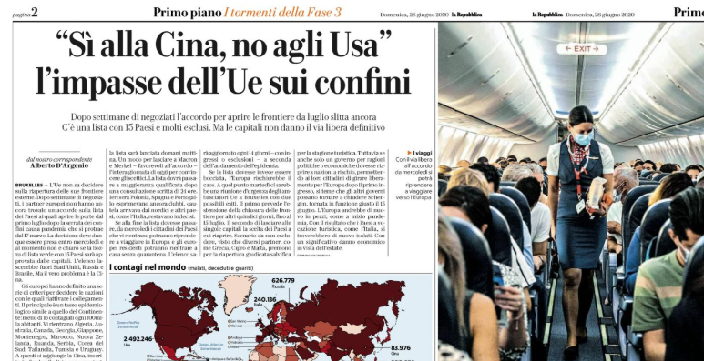 Repubblica: “«Sì alla Cina, no agli Usa». L’impasse dell’Ue sui confini. Dopo settimane di negoziati l’accordo per aprire le frontiere da luglio slitta ancora”