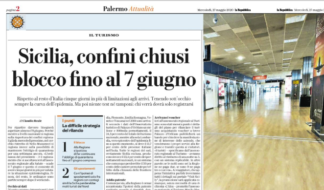 Repubblica: “Sicilia, confini chiusi, blocco fino al 7 giugno. Ma poi niente test né tamponi: chi verrà dovrà solo registrarsi”