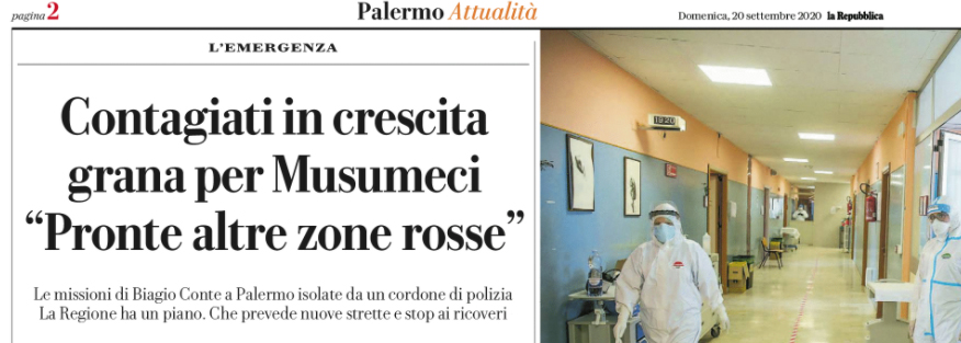Repubblica: “Sicilia. Contagiati in crescita, grana per Musumeci “Pronte altre zone rosse”. La Regione ha un piano che prevede nuove strette e stop ai ricoveri”