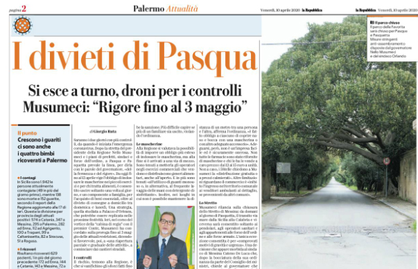 Repubblica: “Sicilia. I divieti di Pasqua. Si esce a turno, droni per i controlli Musumeci: «Rigore fino al 3 maggio»”