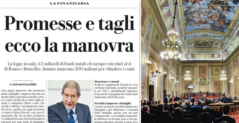 Repubblica: “Sicilia. Promesse e tagli, ecco la manovra. La legge in aula: 1,5 miliardi di fondi statali ed europei vincolati al sì di Roma e Bruxelles. Intanto mancano 200 milioni per chiudere i conti”