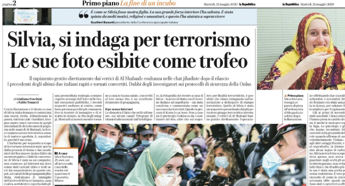 L’edizione odierna de “La Repubblica” si sofferma sul caso di Silvia Aisha Romano, finita nella prigionia di Al Shabaab, feroce organizzazione terroristica somala di matrice qaedista. L’inchiesta per sequestro a scopo di terrorismo internazionale aperta dalla procura di Roma e dai carabinieri del Ros si muove su un interrogativo: come ha potuto una minuscola associazione di volontariato di Fano, Africa Miele onlus, inviare Silvia in una delle zone più pericolose del Kenya? E’ la terza prigioniera su tre, nell’ultimo anno, che dopo il sequestro torna a casa convertita all’Islam. La fotografia del rientro a casa di Silvia è stata condivisa e commentata come un successo dai terroristi.