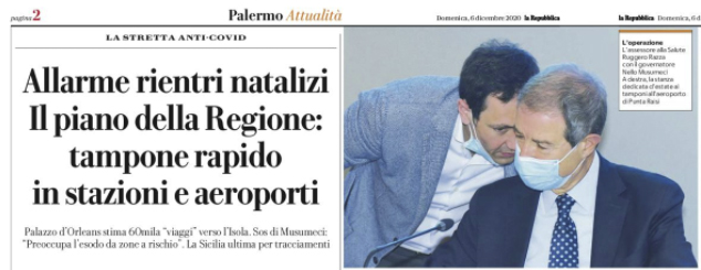 Repubblica: “Sos di Musumeci “Preoccupa l’esodo da zone a rischio”. Allarme rientri natalizi. Il piano della Regione, tampone rapido in stazioni e aeroporti”