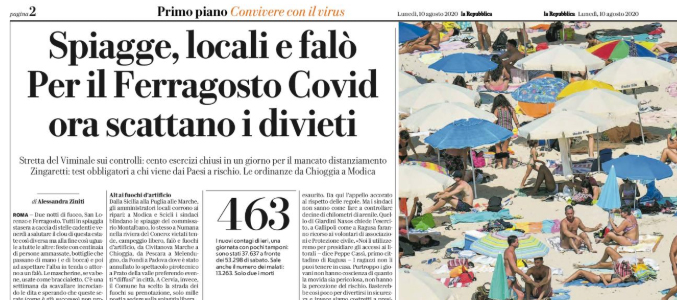 Repubblica: “Spiagge, locali e falò. Per il Ferragosto Covid ora scattano i divieti”