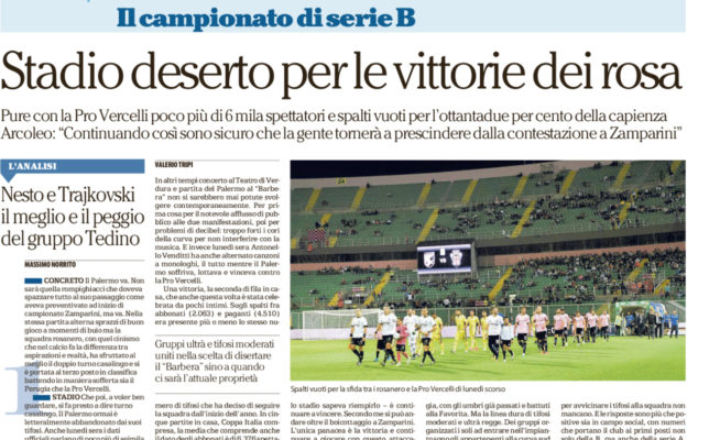 “In altri tempi concerto al Teatro di Verdura e partita del Palermo al “Barbera” non si sarebbero mai potute svolgere contemporaneamente. Per prima cosa per il notevole afflusso di pubblico alle due manifestazioni, poi per problemi di decibel: troppo forti i cori della curva per non interferire con la musica. E invece lunedì sera Antonello Venditti ha anche alternato canzoni a monologhi, il tutto mentre il Palermo soffriva, lottava e vinceva contro la Pro Vercelli. Una vittoria, la seconda di fila in casa, che anche questa volta è stata celebrata da pochi intimi. Sugli spalti fra abbonati (2.063) e paganti (4.510) era presente più o meno lo stesso numero di tifosi che ha deciso di seguire la squadra dall’inizio dell’anno. In cinque partite in casa, Coppa Italia compresa, la media che comprende anche il dato degli abbonati è di 6.376 spettatori. In totale in cinque partite il Palermo ha messo insieme 31.880 spettatori, meno dell’intera capienza dell’impianto di viale del Fante, fissata dalla commissione di vigilanza a 36.365 posti. Un dato che fa ancora più impressione se si considera che in media per ogni partita lo stadio “Barbera” è stato riempito appena per il 17,5 per cento della sua capienza totale. In molti pensavano che i proclami di boicottaggio anti Zamparini sarebbero finiti con le prime vittorie. In molti pensavano che i proclami di boicottaggio anti Zamparini sarebbero finiti con le prime vittorie. La squadra è terza, a un solo punto dalla vetta occupata da Frosinone e Perugia, con gli umbri già passati e battuti alla Favorita. Ma la linea dura di tifosi moderati e ultrà regge. Dei gruppi organizzati i soli ad entrare nell’impianto sono gli appartenenti alla curva sud e i colleghi della nord di Palermo 1900 che mette insieme le vecchie sigle Brigate, Warriors e Angeli della nord. La maggioranza degli ultrà, invece, continua a rimanere fuori, preferendo seguire la squadra in trasferta, piuttosto che in casa per le ragioni più volte dichiarate: fino a quando Zamparini sarà presidente loro non andranno allo stadio. Ragioni condivise anche dai tifosi per così dire moderati, che rimangono a casa piuttosto che andare sugli spalti. Le iniziative da parte del Palermo per avvicinare i tifosi alla squadra non mancano. E le risposte sono più che positive sia in campo social, con numeri che portano il club ai primi posti non solo della B, ma anche della serie A, che fuori dall’impianto di viale del Fante. Oggi, per esempio, i palermitani Accardi, Fiordilino e La Gumina alle 18,30 saranno ospiti dello Store ufficiale del Conca d’Oro e sarà un test per avere la conferma che nei confronti della squadra la passione non è scemata. Dentro lo stadio, però, nemici come prima. E poco importa se quella rosanero è l’unica squadra imbattuta di tutto il campionato. Il ritornello è sempre lo stesso: «Torneremo solo quando Zamparini uscirà di scena»”.