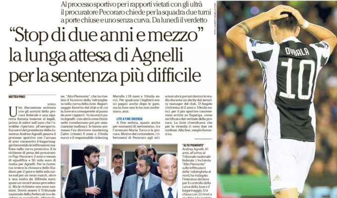 “Una discussione animata con gli uomini della procura federale e una sigaretta fumata insieme ai legali, prima di salire sull’auto che l’avrebbe riportato all’aeroporto. Sui nervi del presidente della Juventus Andrea Agnelli pesava il processo sportivo con l’accusa di aver consentito il bagarinaggio favorendo le infiltrazioni mafiose nella curva juventina. E le richieste di pena del procuratore Figc Pecoraro: 2 anni e mezzo di squalifica e 50 mila euro di multa per Agnelli. Per la Juventus invece la chiusura dello Stadium per 2 gare e della sola curva sud per un terzo match, oltre a una multa da 300mila euro: quasi un record senza precedenti. Ma le richieste non sono sanzioni. Dovrà essere il Tribunale nazionale della Federcalcio a decidere se accoglierle, riformulare le sanzioni al ribasso o prosciogliere: ha 10 giorni di tempo, ma da Torino sperano che la sentenza arrivi presto, già lunedì, per mettersi alle spalle il primo grado di una vicenda imbarazzante. «Puntiamo all’assoluzione piena», spiega il legale Coppi. DOPO LA SENTENZA In caso di condanna, Agnelli fin da subito non potrebbe rappresentare il club in ambito federale. In ogni caso, lui e la Juventus avranno 7 giorni di tempo per fare ricorso: chiedendo anche la sospensiva della squalifica del campo. Importantissima, visto che le prossime due gare allo Stadium sono con la Fiorentina e il derby con il Torino. La presidenza del club non è in discussione, se però la squalifica alla fine dei 3 gradi di giudizio superasse i 12 mesi, Agnelli sarebbe interdetto dal ricoprire cariche federali per 10 anni. Il giudice Mastrocola che presiede la commissione di primo grado potrebbe anche chiedere la «trasmissione a Fifa e Uefa» della sentenza. Nel caso, lo stop potrebbe essere esteso anche all’Esecutivo Uefa di cui Agnelli è membro. Difficile però: in Europa è consuetudine attendere il 3° grado di giudizio, quello al Collegio di garanzia del Coni. L’INCHIESTA L’accusa è figlia dell’indagine,