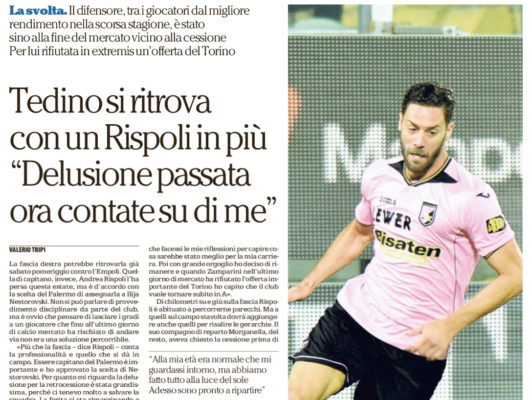 “La fascia destra potrebbe ritrovarla già sabato pomeriggio contro l’Empoli. Quella di capitano, invece, Andrea Rispoli l’ha persa questa estate, ma è d’accordo con la scelta del Palermo di assegnarla a Ilija Nestorovski. Non si può parlare di provvedimento disciplinare da parte del club, ma è ovvio che pensare di lasciare i gradi a un giocatore che fino all’ultimo giorno di calcio mercato ha rischiato di andare via non era una soluzione percorribile. «Più che la fascia – dice Rispoli – conta la professionalità e quello che si dà in campo. Essere capitano del Palermo è importante e ho approvato la scelta di Nestorovski. Per quanto mi riguarda la delusione per la retrocessione è stata grandissima, perché ci tenevo molto a salvare la squadra. La ferita si sta rimarginando e voglio ripartire con la convinzione di essere protagonista come l’anno scorso». Quella di Rispoli è stata un’estate da montagne russe. Prima del mancato closing Paul Baccaglini lo aveva designato come leader di quello che l’italoamericano chiamava Palermo 2.0. Quando poi Zamparini ha ripreso in mano ufficialmente la società è stato inserito fra gli incedibili, ma sin dal primo giorno di ritiro era chiaro come fosse fra quelli che avevano chiesto di essere ceduti. C’è stata poi anche una fase in cui la proprietà ha chiaramente detto che era disposta ad accontentare il giocatore, ma che non c’erano richieste, fino all’offerta del Torino nell’ultimo giorno di mercato. «A 29 anni non sono più un ragazzino – racconta Rispoli – era normale che facessimo delle valutazioni sul futuro con la società dopo la retrocessione. Ho esternato le mie perplessità, c’erano richieste, ci siamo parlati molto chiaramente con Zamparini e abbiamo fatto tutto alla luce del sole senza nessun problema. Non avevo chiesto delle garanzie perché non sono né un dirigente, né un allenatore. La società mi aveva chiesto di rimanere, ma era normale che facessi le mie riflessioni per capire cosa sarebbe stato meglio per la mia carriera. Poi con grande orgoglio ho deciso di rimanere e quando Zamparini nell’ultimo giorno di mercato ha rifiutato l’offerta importante del Torino ho capito che il club vuole tornare subito in A». Di chilometri su e giù sulla fascia Rispoli è abituato a percorrerne parecchi. Ma a quelli sul campo stavolta dovrà aggiungere anche quelli per risalire le gerarchie. Il suo compagno di reparto Morganella, del resto, aveva chiesto la cessione prima di sapere che anche lui avrebbe fatto altrettanto. Poi ha scelto di rimanere quando sembrava che per l’addio di Rispoli mancasse solamente l’ufficialità. In coppa e in campionato è toccato sempre allo svizzero giocare dal primo minuto. «L’allenatore capisce le situazioni – fa notare Rispoli – siamo uomini, sapeva quello che stava succedendo. Parlavamo ogni giorno, adesso è il momento di voltare pagina e pensare solo al futuro. Sono pronto a dare tutto. Dal gruppo ho avuto attestati di stima, anche loro capivano quello che stavo passando. Con il mio lavoro saprò ripagare anche la fiducia dei miei compagni. Con Morganella sappiamo bene come è fatta la serie B, servono qualità e voglia, si deve sapere soffrire, lottare e rimanere compatti. Io e lui dobbiamo dare tutto in partita e in allenamento. Tutto il resto passa in secondo piano. Sto bene, a prescindere dalle scelte di Tedino, la squadra deve pensare a battere l’Empoli. A Brescia abbiamo dimostrato che chiunque giochi sa fare il bene del Palermo. Questa è la strada giusta»”. Questo quanto riportato da “La Repubblica”.