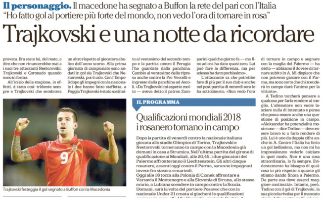 A Tedino toccherà pensare a qualcosa per farlo rendere al meglio. L’allenatore non vuole lasciare nulla di intentato e pensa che possa essere anche una questione di posizione in campo. «Aleksandar ha potenzialità mostruose — dice Tedino — devo essere bravo io a farlo rendere di più. Lui è uno da doppia cifra anche in A. Contro l’Italia ha fatto un gol bellissimo, ma non mi ha impressionato vederlo calciare in quel modo. Non è una cosa straordinaria, lo fa sempre. Evidentemente ha bisogno di qualcosa in più rispetto a quanto gli stiamo dando finora a Palermo. Da parte sua deve esserci maggiore continuità». Intanto, però, Tedino con il gol di Trajkovski, la sua piccola rivalsa per il mancato rinvio delle partite se l’è già presa. «Non ho mai sperato nel rinvio — dice — perché conosco come funziona il sistema. Che Trajkovski segni contro l’Italia, però, per me è un segno del destino»”. Questo ciò che si legge sull’edizione odierna de “La Repubblica”.