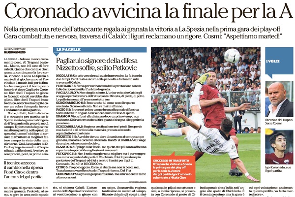 “Adesso manca veramente poco. Al Trapani basterà… Ma no, non è il caso di fare calcoli. Quello che conta è che i granata continuano la loro corsa, vincono 1 a 0 a La Spezia e martedì si giocheranno al Provinciale il match ball per la finale che assegnerà il terzo posto in serie A dopo Cagliari e Crotone. Dire che il Trapani ha giocato facendo calcoli sarebbe sbagliato. Dire che il Trapani è stato cinico, accorto e ha colpito come un cobra fotografa invece l’andamento della partita. Non è, infatti, frutto di calcoli o strategie pre partita se lo Spezia inizia la gara costringendo il Trapani nella propria metà campo. È piuttosto la logica trama di una partita nella quale gli spezzini hanno l’obbligo di cercare di sfruttare al meglio il fattore campo in vista della gara di ritorno. Così, la squadra di Di Carlo spinge in avanti e il Trapani bada a difendersi. A volere essere precisi, però, la prima azione degna di questo nome è di marca granata. Petkovic, al sesto, si gira in area nello spazio di un fazzoletto e batte a rete. Chichizola è bravo a mandare in calcio d’angolo. Per il resto la chiave tattica della prima parte della gara è scontata. Spezia a fare gioco, Trapani a contrastare. Con i granata schierati al limite della loro area di rigore, però i liguri faticano a trovare spazi nei quali inserirsi. Allora serve la giocata del singolo che, nella fattispecie, si chiama Calaiò. L’attaccante dello Spezia è bravissimo al ventitreesimo a girare con una rovesciata acrobatica un pallone che viene respinto dalla traversa con Nicolas battuto. Brivido a parte, il Trapani gioca bene anche se non è bello a vedersi, ma la sofferenza, le ripartenze, il sacrificio fanno parte del calcio e il Trapani in campo mette tutto questo. È vero, lascia l’iniziativa allo Spezia ma quando riparte lo fa in maniera ordinata. La difesa non perde un colpo, Scozzarella ragiona tantissimo in mezzo al campo, Rizzato chiude gli spazi a sinistra come Fazio fa a destra. Il problema è lì davanti. Petkovic è troppo isolato e Citro non la becca quasi mai. Così i granata faticano ad allentare la pressione e, proprio alla scadere, rischiano tantissimo con Perticone che interviene fallosamente su Piccolo. È rigore per tutti tranne che per l’arbitro e il Trapani si salva. Cosmi capisce che deve dare qualcosa in più al suo attacco e così, a inizio ripresa, si presenta con Coronado al posto di Citro. Sarà la mossa vincente perché, nonostante Di Carlo cambi tre uomini su tre e le provi tutte, gli attacchi spezzini si vanno a infrangere sulla barriera dei difensori granata. E, come spesso è capitato in questo campionato, il Trapani colpisce quando meno te lo aspetti. Petkovic s’inventa un assist per Coronado che taglia tutto il campo. Controllo e tiro in diagonale che s’infila nell’angolo alle spalle di Chichizola. È il trentatreesimo, ma la gara è come se finisse in quel momento. Il Trapani, che ha gestito tranquillamente per tutta la gara, accompagna lo scorrere del cronometro sino alla fine. «Forse è la prima volta che raccogliamo più di quanto avremmo meritato nel corso dei novanta minuti — dice Serse Cosmi a fine gara — Questo però è un confronto che va considerato nell’arco delle due partite per cui ogni valutazione, anche sotto questo profilo, va fatta martedì sera». E mentre il clamore dei clacson della auto scese in strada a Trapani per festeggiare arriva sino a La Spezia, anche il diesse granata Daniele Faggiano, senza più voce applaude i suoi. «Abbiamo sfruttato al meglio le ripartenze — dice Faggiano — Una vittoria importante ma adesso non abbassiamo la guardia»”. Questo quanto si legge sull’edizione odierna de “La Repubblica”.