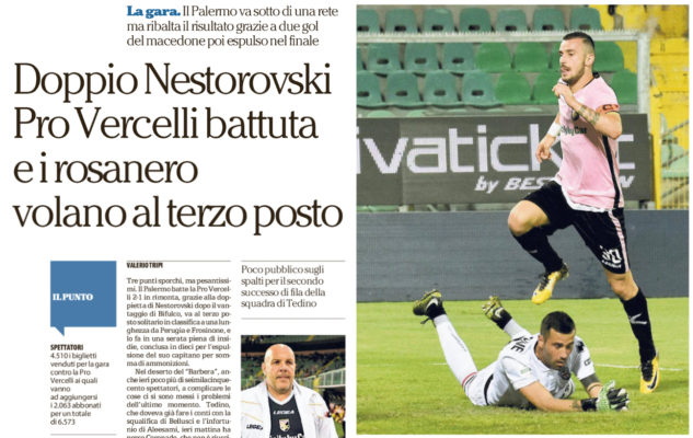 “Tre punti sporchi, ma pesantissimi. Il Palermo batte la Pro Vercelli 2-1 in rimonta, grazie alla doppietta di Nestorovski dopo il vantaggio di Bifulco, va al terzo posto solitario in classifica a una lunghezza da Perugia e Frosinone, e lo fa in una serata piena di insidie, conclusa in dieci per l’espulsione del suo capitano per somma di ammonizioni. Nel deserto del “Barbera”, anche ieri poco più di seimilacinquecento spettatori, a complicare le cose ci si sono messi i problemi dell’ultimo momento. Tedino, che doveva già fare i conti con la squalifica di Bellusci e l’infortunio di Aleesami, ieri mattina ha perso Coronado, che non è riuscito a recuperare dal problema muscolare agli adduttori, e poi Jajalo per il riacutizzarsi di un vecchio infortunio. Visti gli impegni con le nazionali che stanno per riproporsi come difficoltà sulla strada dei rosanero, l’allenatore di Udine ha preferito non rischiare gli acciaccati e si è ritrovato in panchina solamente cinque giocatori di movimento oltre i due portieri. In campo al posto del brasiliano Tedino manda Trajkovski al fianco di Nestorovski, con la linea di centrocampo a cinque composta da Rispoli sulla fascia destra, Gnahorè, Murawski e Chochev in mezzo, con Morganella a sinistra; Cionek, Struna e Szyminski in difesa davanti a Posavec. Il portiere croato, come sempre fra gli osservati speciali, prima dell’inizio della partita ha raccolto gli applausi dei tifosi della curva sud, lato del campo in cui il Palermo si è sistemato al calcio d’inizio. L’inizio della partita è tutto di marca piemontese. Il modo in cui i giocatori ospiti interpretano il 4-4-2 dell’allenatore della Pro Vercelli Gianluca Grassadonia permette di avere la superiorità numerica a centrocampo visto che gli attaccanti tendono a chiudere sulla fascia dal lato in cui il Palermo prova a impostare la manovra. Un accorgimento che unito agli errori in fase di passaggio dei giocatori rosanero diventa una miscela esplosiva e libera alla conclusione prima Castiglia, poi due volte Ghiglione. Posavec si disimpegna bene e in un’occasione, sul secondo tiro di Ghiglione dall’area piccola, gli dà una mano Struna che chiude tempestivamente. Tedino, che era partito con Murawski da solo davanti alla difesa con Gnahorè e Chochev mezzali, arretra il bulgaro accanto al polacco a protezione della difesa con il francese vertice alto di un ipotetico triangolo di centrocampo e chiede a Trajkovski di dare una mano in fase di copertura. Proprio quando sembra che le contromisure abbiano sortito il giusto effetto la Pro Vercelli passa in vantaggio. Gnahorè, al ventesimo, pecca di sufficienza e regala un angolo: sugli sviluppi Vives crossa dalla destra, Bergamelli gira in porta al volo e Posavec effettua una bella parata di piede; la palla s’impenna, il croato si rialza da terra e di pugno libera l’area piccola; sulla respinta arriva Bifulco che segna con una conclusione al volo. La reazione rosanero non tarda ad arrivare, passano cinque minuti e Nestorovski ristabilisce la parità proteggendo prima e tirando imparabilmente poi un bel pallone servito in verticale dalla trequarti da Chochev. Il problema per le due squadre in campo è l’altissima percentuale di errori in fase di costruzione e di chiusure difensive. A rischiare di più prima della fine del tempo è il Palermo che viene salvato inconsapevolmente da Posavec. Il portiere prima smanaccia un cross pericoloso dalla sinistra di Bifulco, poi nel prosieguo dell’azione si fa male scontrandosi con Szyminski e resta a terra dando le spalle a Vives che dal limite tira e lo colpisce. La palla finisce in calcio d’angolo lentamente sfiorando il palo. La sagra degli errori prosegue anche nel secondo tempo, ma n avvio ne approfittano i rosanero ancora sull’asse Chochev-Nestorovski. Il bulgaro, al sesto, serve un pallone filtrante in area che il macedone dalla sinistra in diagonale mette alle spalle del portiere ospite Marcone. Tedino, vede che i suoi non sono brillanti atleticamente e al quarto d’ora manda in campo Dawidowicz al posto di Gnahorè, schierandolo a centrocampo a dare manforte a Chochev, spostando qualche metro più avanti Murawski. Poi inserisce anche Embalo per Trajkovski riuscendo a congelare la situazione fino all’ultimo quando Nestorovski si fa ammonire per la seconda volta per un fallo di mano un po’ ingenuo”. Questa l’analisi del match realizzata dall’edizione odierna de “La Repubblica”.