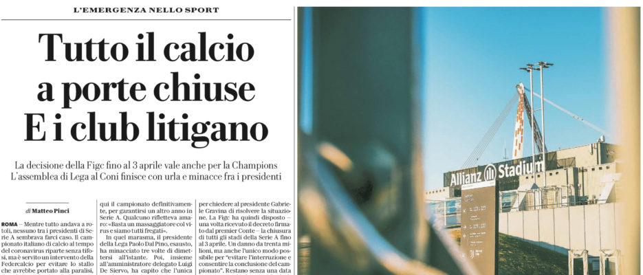 Ieri si è svolta l’assemblea di Lega al Coni per decidere le sorti della Serie A vista l’emergenza Coronavirus. L’edizione odierna di “Repubblica” fa il punto della situazione, la decisione di recuperare le partite di Serie A nel prossimo weekend non è stata per nulla semplice e ha scatenato tensioni tra i vari presidenti di Serie A. Tutto ciò, proprio mentre il governo stilava il decreto con scadenza 3 aprile che estende a tutta Italia il divieto di scendere in campo in stadi aperti. Obbligando le società a effettuare «controlli idonei a contenere il rischio diffusione del virus tra atleti, tecnici, dirigenti e accompagnatori».