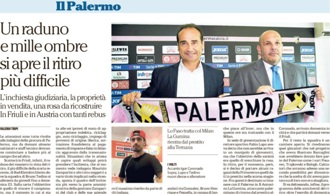 “Le attenzioni sono tutte rivolte alle indagini della procura di Palermo, ma da domani almeno calciatori e staff tecnico dovranno cominciare a badare più al campo che ad altro. Scatterà in Friuli, infatti, il raduno dei rosanero in vista del ritiro, il più difficile della storia recente, di Bad Kleinkirchheim dove la squadra di Bruno Tedino si allenerà da giovedì fino a domenica 23. Sulla carta l’obbiettivo è quello di vincere il campionato, ma il contesto in cui si sta muovendo il Palermo non è proprio quello sereno di una squadra che è “condannata” alla promozione. Certo non sarà facile isolarsi del tutto vista la situazione legata alle sei ipotesi di reato di appropriazione indebita, riciclaggio, auto riciclaggio, impiego di proventi di origine illecita, sottrazione fraudolenta al pagamento di imposte e falso in bilancio aggravato dalla transnazionalità. Situazioni che in attesa di capire quali sviluppi potrà prendere l’inchiesta, che al momento vede indagato Maurizio Zamparini e altri otto soggetti a vario titolo implicati nella vicenda, sposta il quadro dell’inchiesta più verso la parte amministrativa della gestione Zamparini del club e delle sue aziende che verso la vita della squadra di calcio. Nessuno degli indagati è palermitano e nessuno è legato al mondo di agenti, ex dirigenti del club e procuratori sportivi. Sui nomi, però, continua a restare il massimo riserbo da parte di chi indaga. A proposito di nomi, c’è attesa anche per capire quali saranno i giocatori che compariranno nell’elenco dei convocati da Tedino per il ritiro. Rispetto alla squadra che è retrocessa sono andati via Gonzalez, Bruno Henrique e Pezzella, in rampa di lancio ci sono anche Diamanti e Gazzi che non rientrano nei piani del club, nonostante l’indiscusso livello tecnico e d’esperienza, e soprattutto Lo Faso, giovane attaccante classe 1998 che piace all’Inter, ma che in queste ore sta trattando con il Milan. In sede di presentazione il direttore sportivo Fabio Lupo aveva detto che non sarebbe arrivato un manipolo di giovanotti, ma che l’obiettivo della società era quello di svecchiare la rosa. In ritiro, per il momento, però, si è deciso di portare alcuni ragazzi della Primavera e quelli dati in prestito nella scorsa stagione. Fra questi è destinato a rimanere con il Palermo in B Antonino La Gumina, attaccante palermitano di ritorno dal prestito alla Ternana. Gli unici acquisti al momento sono Andre Ingegneri, difensore centrale che arriva dalla Lega Pro, anche lui dal Pordenone come l’allenatore Tedino, e Igor Coronado, arrivato domenica in città e che partirà domani verso il Friuli. Per il resto la squadra è un cantiere aperto. Si rivedranno quei giocatori che nel progetto che aveva illustrato Baccaglini non avrebbero dovuto fare parte del Palermo come i vari Posavec, Trajkovski e Balogh. Calciatori che avranno adesso una seconda possibilità per dimostrare che la scelta di chi aveva puntato su di loro non era sbagliata. Si va delineando, infine, il programma delle amichevoli del ritiro: oltre l’esordio di domenica alle 17 a Bad Kleinkirchheim i rosanero torneranno in campo il 22 luglio sempre alle 17 contro gli sloveni dell’Nd Ilirija 1911, club di seconda divisione.”. Questo quanto si legge sull’edizione odierna de “La Repubblica”.