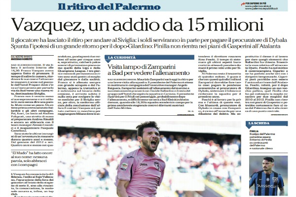 Repubblica: “Vazquez addio da 15 milioni. Torna Pinilla? Mascardi…”