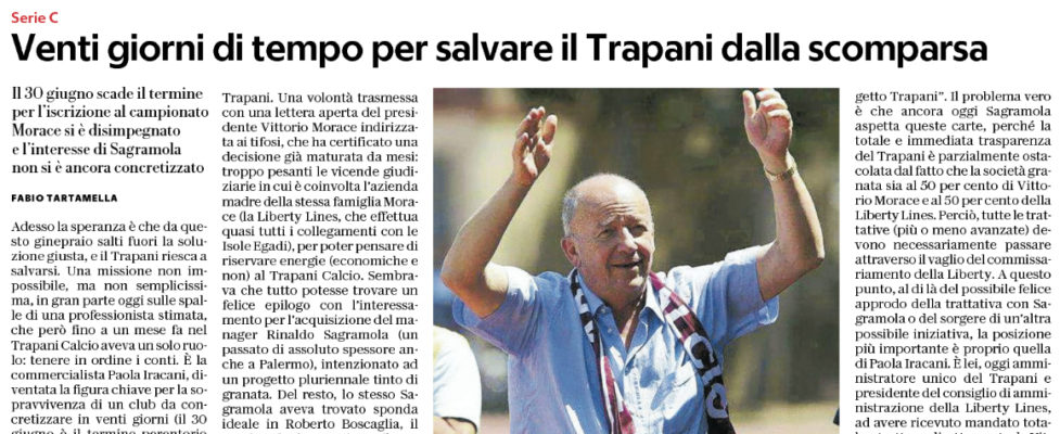 “Adesso la speranza è che da questo ginepraio salti fuori la soluzione giusta, e il Trapani riesca a salvarsi. Una missione non impossibile, ma non semplicissima, in gran parte oggi sulle spalle di una professionista stimata, che però fino a un mese fa nel Trapani Calcio aveva un solo ruolo: tenere in ordine i conti. È la commercialista Paola Iracani, diventata la figura chiave per la sopravvivenza di un club da concretizzare in venti giorni ( il 30 giugno è il termine perentorio entro il quale si deve procedere all’iscrizione in serie C). La vicenda, in sé, ha una logica stringente. Probabilmente speranzosa di poter agguantare sul campo la serie B, la famiglia Morace, proprietaria della società, ha atteso prima di manifestare la sua legittima e prevedibile intenzione di disimpegnarsi totalmente dal Trapani. Una volontà trasmessa con una lettera aperta del presidente Vittorio Morace indirizzata ai tifosi, che ha certificato una decisione già maturata da mesi: troppo pesanti le vicende giudiziarie in cui è coinvolta l’azienda madre della stessa famiglia Morace ( la Liberty Lines, che effettua quasi tutti i collegamenti con le Isole Egadi), per poter pensare di riservare energie ( economiche e non) al Trapani Calcio. Sembrava che tutto potesse trovare un felice epilogo con l’interessamento per l’acquisizione del manager Rinaldo Sagramola ( un passato di assoluto spessore anche a Palermo), intenzionato ad un progetto pluriennale tinto di granata. Del resto, lo stesso Sagramola aveva trovato sponda ideale in Roberto Boscaglia, il tecnico che ha trascinato il Trapani dalla serie D alla B e che con Sagramola aveva trovato empatia nell’esperienza di Brescia. « Aspetto di vedere alcune carte della società, per ciò che riguarda i contratti in essere dei calciatori » , aveva detto Sagramola qualche giorno fa, confidando nel fatto che avrebbe trovato un investitore interessato al “ progetto Trapani”. Il problema vero è che ancora oggi Sagramola aspetta queste carte, perché la totale e immediata trasparenza del Trapani è parzialmente ostacolata dal fatto che la società granata sia al 50 per cento di Vittorio Morace e al 50 per cento della Liberty Lines. Perciò, tutte le trattative ( più o meno avanzate) devono necessariamente passare attraverso il vaglio del commissariamento della Liberty. A questo punto, al di là del possibile felice approdo della trattativa con Sagramola o del sorgere di un’altra possibile iniziativa, la posizione più importante è proprio quella di Paola Iracani. È lei, oggi amministratore unico del Trapani e presidente del consiglio di amministrazione della Liberty Lines, ad avere ricevuto mandato totale a trattare, direttamente da Vittorio Morace e dalla moglie Anne Marie Collart (ormai residenti stabilmente a Malaga). Ed è lei che dovrà compiere i passi necessari per semplificare una cessione che, se non realizzata, potrebbe condurre ad uno scenario drammatico: la scomparsa del Trapani”. Questo quanto riportato dall’edizione odierna de “La Repubblica”.