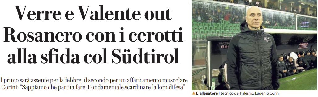 Repubblica: “Verre e Valente out. Rosanero con i cerotti alla sfida col Südtirol”