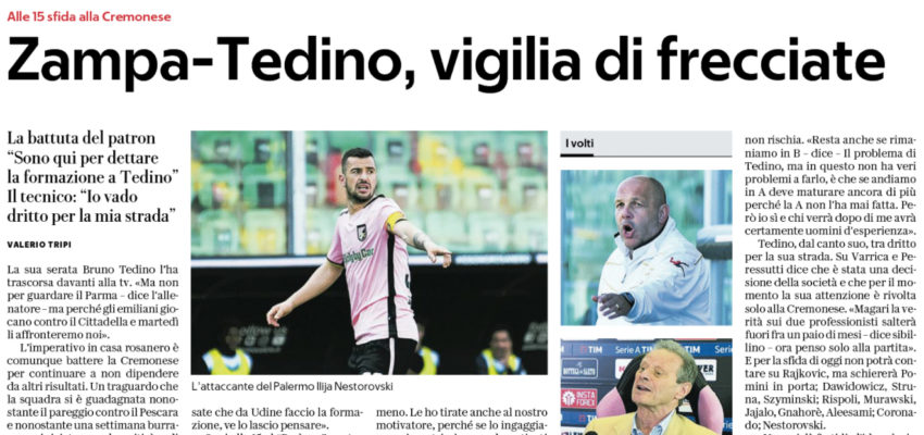 «Non mi dà fastidio l’idea che in giro si pensi che è Zamparini a fare la formazione – sottolinea Tedino – tanto per molti ero e sono un signor nessuno. Porto avanti il lavoro iniziato quasi dieci mesi fa e a chi dice che Zamparini ci mette pressione rispondo che quando hai delle ambizioni devi avere delle pressioni»”.