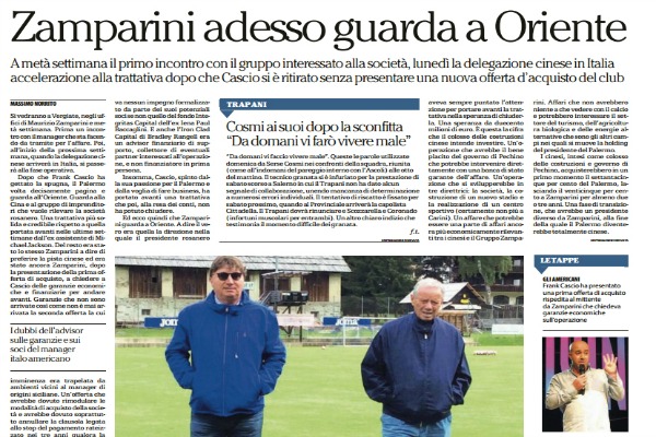 Repubblica: “Zamparini adesso guarda a Oriente. Lunedi delegazione cinese in Italia. Cascio non ha mai presentato offerta credibile…”