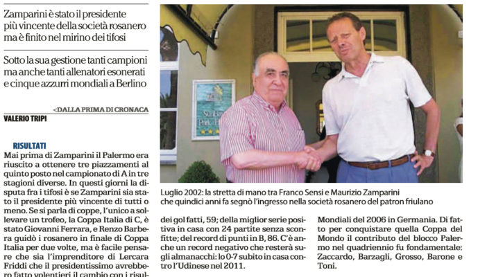 Al netto delle imprese compiute sui campi d’Italia e d’Europa, come la vittoria a Londra sul campo del West Ham, ci sono primati firmati Zamparini. Mai nessuno è riuscito a vincere in Italia sul campo della Juve per tre stagioni di fila. Appartengono all’era del patron anche i record di punti in A, 65; dei gol fatti, 59; della miglior serie positiva in casa con 24 partite senza sconfitte; del record di punti in B, 86. C’è anche un record negativo che resterà sugli almanacchi: lo 0-7 subito in casa contro l’Udinese nel 2011. È vero che Zamparini ha ceduto tantissimi giocatori e che se avesse avuto la lungimiranza di trattenerne qualcuno per qualche anno in più avrebbe raggiunto risultati migliori sia in termini economici che sportivi, ma è altrettanto vero che quei giocatori li ha ingaggiati proprio Zamparini. Poche volte è successo che un suo direttore sportivo o un suo consulente gli portassero un calciatore a sua insaputa. Da Amauri a Miccoli di giocatori che hanno fatto deliziare i tifosi ce ne sono stati parecchi: fare una classifica è impossibile, ma basta pensare a quelli che sono protagonisti sui campi della Champions, da Cavani a Pastore, da Barzagli a Dybala, da Sirigu a Darmian, passando per Glik, Balzaretti e Grosso. Quest’ultimo era appena stato ceduto dal Palermo all’Inter quando calciò il rigore decisivo ai Mondiali del 2006 in Germania. Di fatto per conquistare quella Coppa del Mondo il contributo del blocco Palermo nel quadriennio fu fondamentale: Zaccardo, Barzagli, Grosso, Barone e Toni. Come per i giocatori, anche per gli allenatori vale lo stesso calcolo. È vero che ne ha cacciati tantissimi, affidandosi a trentanove gestioni diverse in quindici anni. Ma è altrettanto vero che ha scelto uomini che sono rimasti nel cuore dei palermitani da Guidolin, il tecnico che ha riportato il Palermo in A dopo 32 anni, a Rossi, l’uomo della finale di Coppa Italia e dei record; da Iachini, suo il primato di punti in B, a Ballardini, autore dell’ultima salvezza. Numeri e fotografie, forse un po’ sbiadite, che fanno parte della storia rosanero e che contrastano con i cori, gli striscioni e la contestazione di questi giorni. Gli ultimi della presidenza Zamparini”. Questo quanto riportato da “La Repubblica”.