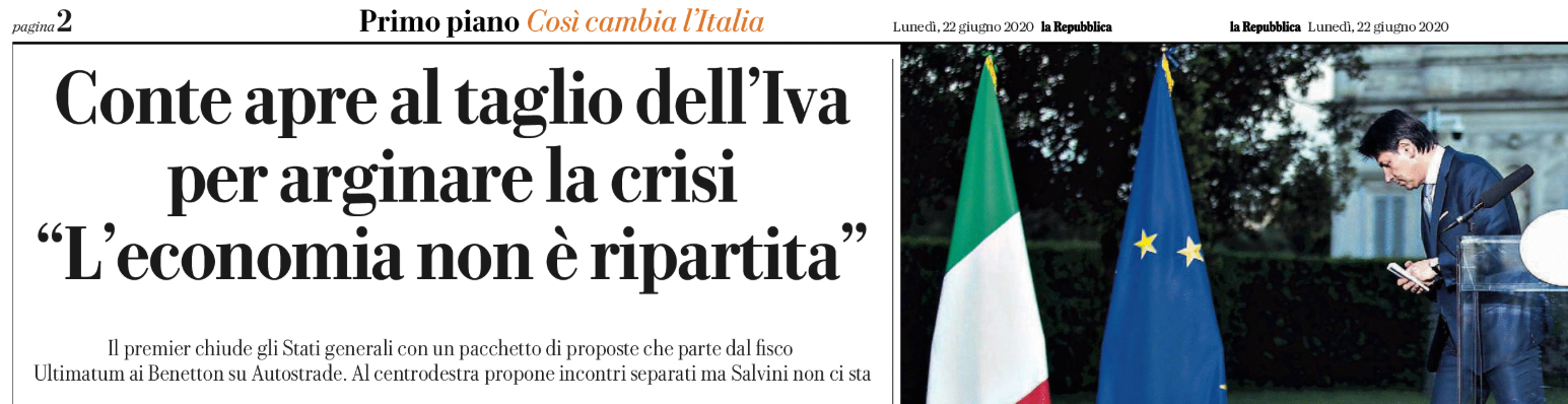 L’edizione odierna di “Repubblica” riporta le parole del Premier Conte dopo gli stati generali. «Dovremo intervenire per un nuovo scostamento di bilancio – ammette il premier – . Le risorse stanziate finora non sono sufficienti a causa dell’impatto di questo annus horribilis dal punto di vista economico e sociale». Da questo allarme deriva l’ipotesi di riattivare il sistema ritoccando l’Iva al ribasso (ad esempio per alcuni settori in crisi come ristorazione, spettacoli e turismo), che il premier non nega: «La Germania l’ha fatto. È una delle ipotesi discusse. Non abbiamo deciso, lo faremo in settimana, anche perché è una misura costosa».