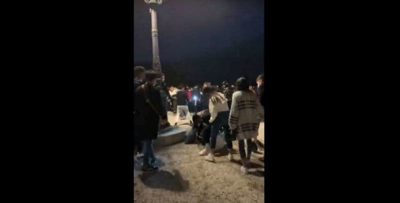 Dai filmati si nota anche l’intervento delle forze dell’ordine in tenuta antisommossa per disperdere l’assembramento.