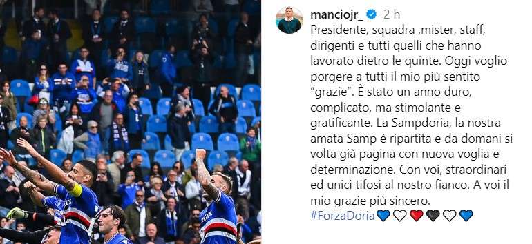 «Presidente, squadra ,mister, staff, dirigenti e tutti quelli che hanno lavorato dietro le quinte. Oggi voglio porgere a tutti il mio più sentito “grazie”. È stato un anno duro, complicato, ma stimolante e gratificante. La Sampdoria, la nostra amata Samp é ripartita e da domani si volta già pagina con nuova voglia e determinazione. Con voi, straordinari ed unici tifosi al nostro fianco. A voi il mio grazie più sincero».