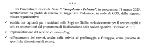 Sampdoria-Palermo: gara con restrizioni per l’Osservatorio Nazionale sulle Manifestazioni Sportive